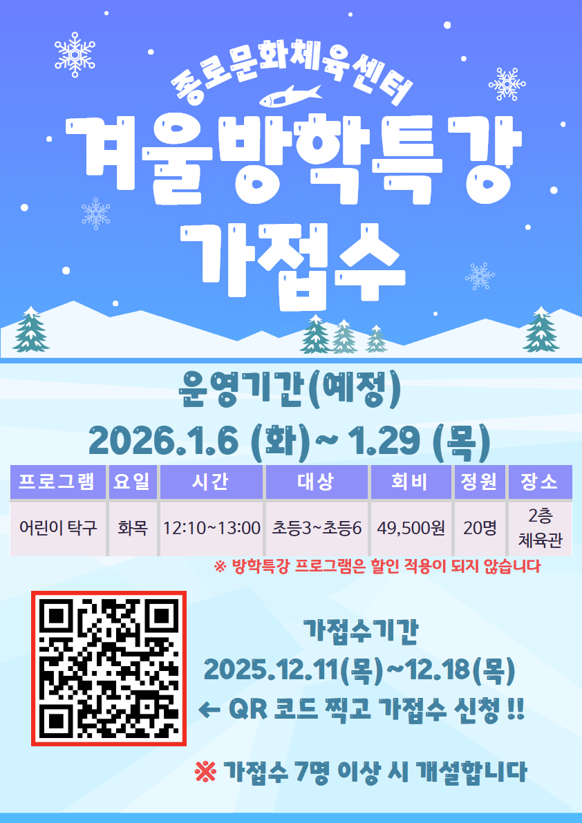 공지사항 게시판 상세 종로문화체육센터 탁구 겨울방학특강 가접수 실시 시설명 종로문화체육센터 등록일 2025년 12월 11일 18시 0분 조회수 36 파일 탁구 겨울방학특강 가접수 안내지.jpg [ Size : 652.18KB , Down : 8 ] 미리보기 다운로드 목록보기