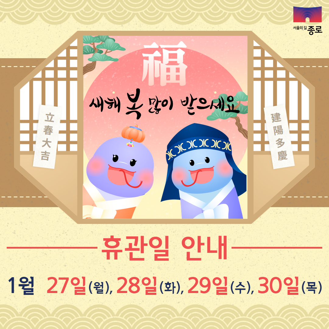 공지사항 게시판 상세 1월 설 연휴 휴관 안내 시설명 종로구시설관리공단 등록일 2025년 1월 13일 15시 2분 조회수 1,006 파일 test (1).jpg [ Size : 1.01MB , Down : 130 ] 미리보기 다운로드 목록보기