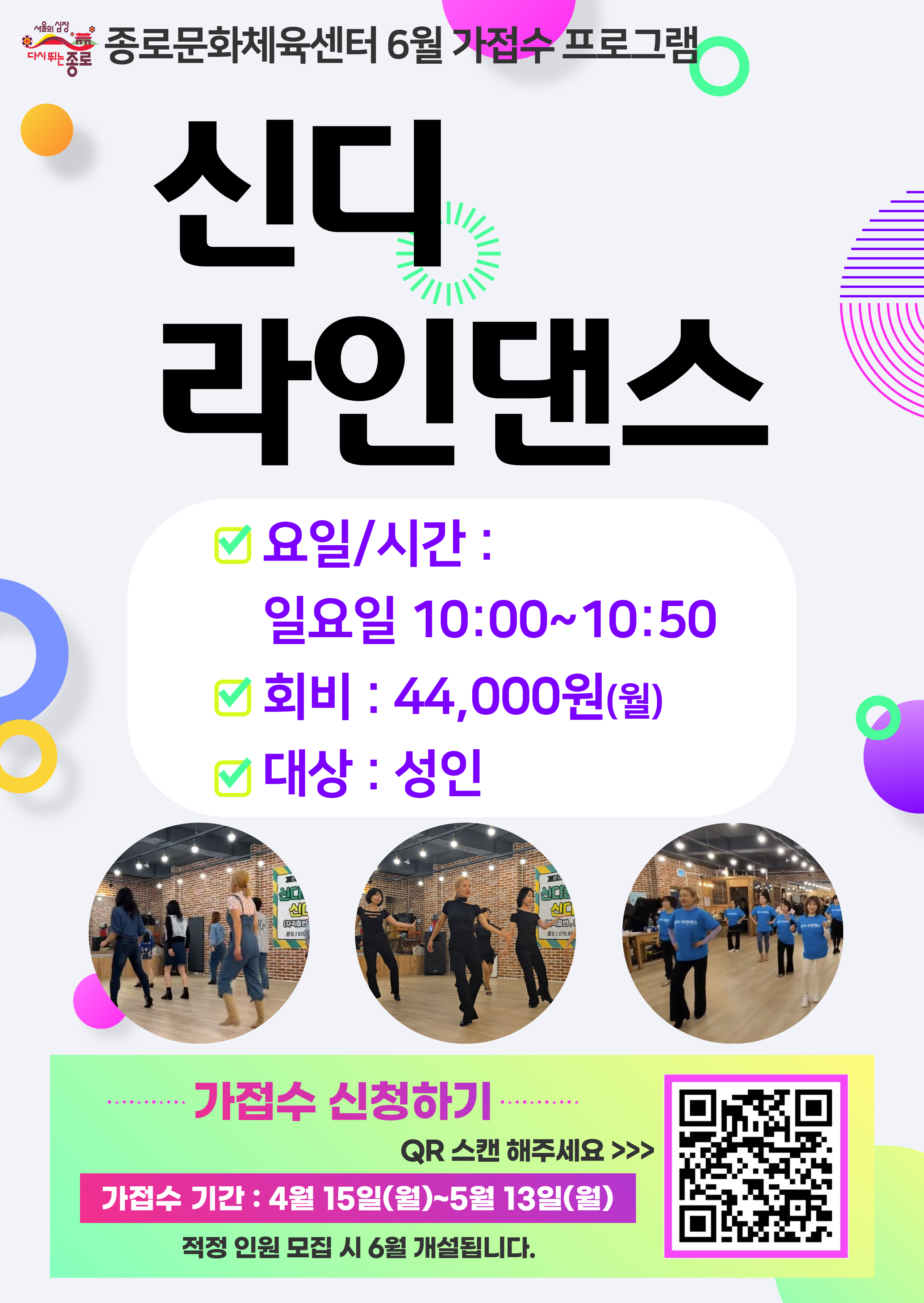 공지사항 게시판 상세 6월 개설 예정 <신디 라인댄스> 가접수 시설명 종로문화체육센터 등록일 2024년 4월 12일 17시 31분 조회수 875 파일 문화체육센터팀 6월 신디라인댄스 가접수 안내지.jpg [ Size : 2.57MB , Down : 779 ] 미리보기 다운로드 목록보기