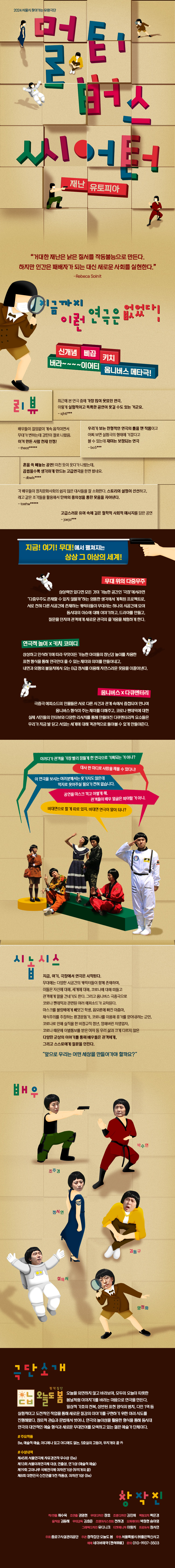 안녕하십니까 구민이 행복한 문화체육플랫폼 1등공단 종로구시설관리공단입니다. 종로구시설관리공단에서는 구민의 문화향유기회 확대를 위해 서울시 주관 '찾아가는 유랑극단'사업의 운영자로 2년 연속 선정되었습니다. 서울시 선정 우수 공연을 주민들에게 무료로 제공하니 관심있는 주민들께서는 많은 참여 바랍니다. *광화문아트홀은 주차가 지원되지 않습니다. 대중교통을 이용하여 주시기 바랍니다. 이번에 소개할 공연은 멀티버스씨어터 재난 유토피아(창작극단 오늘도 봄)입니다.