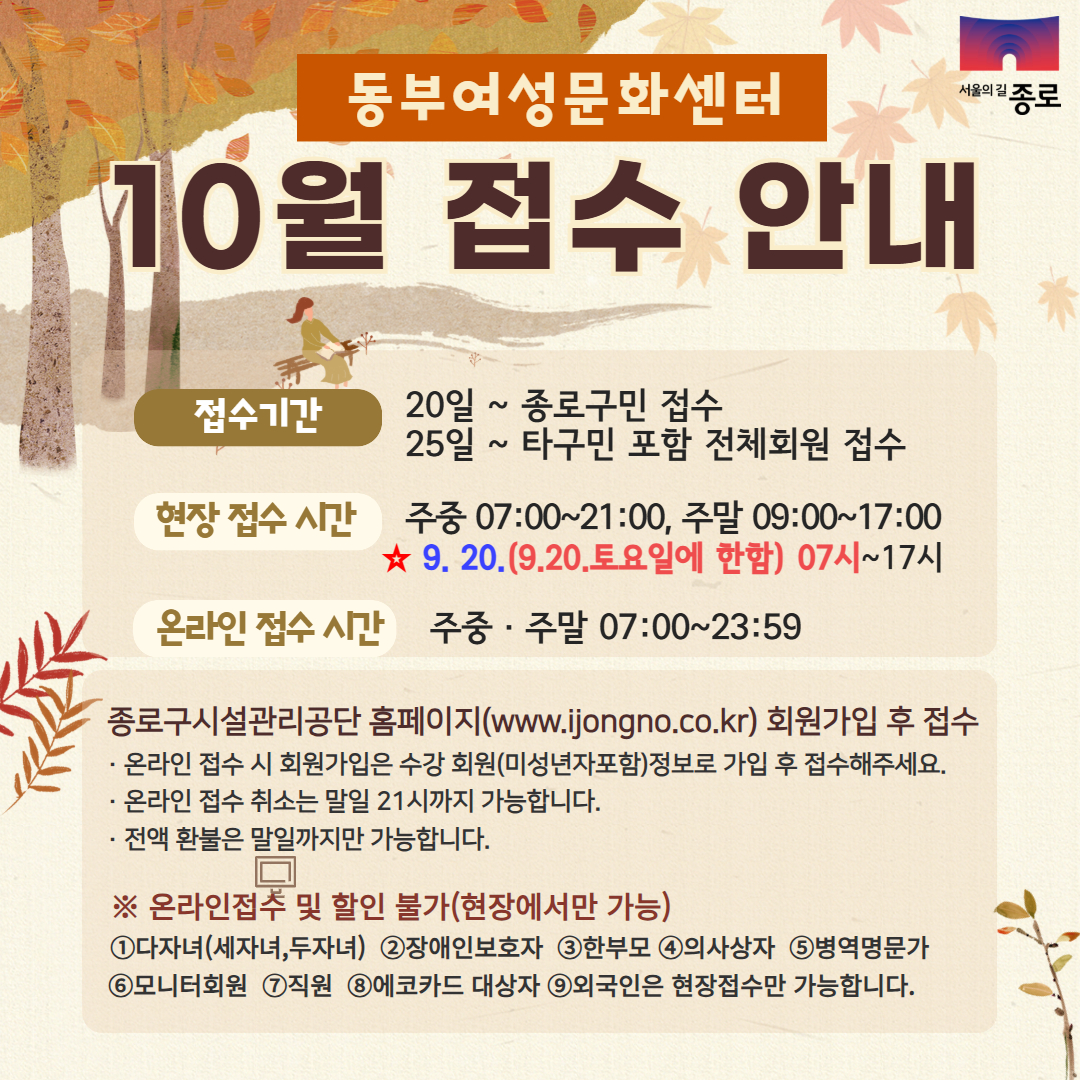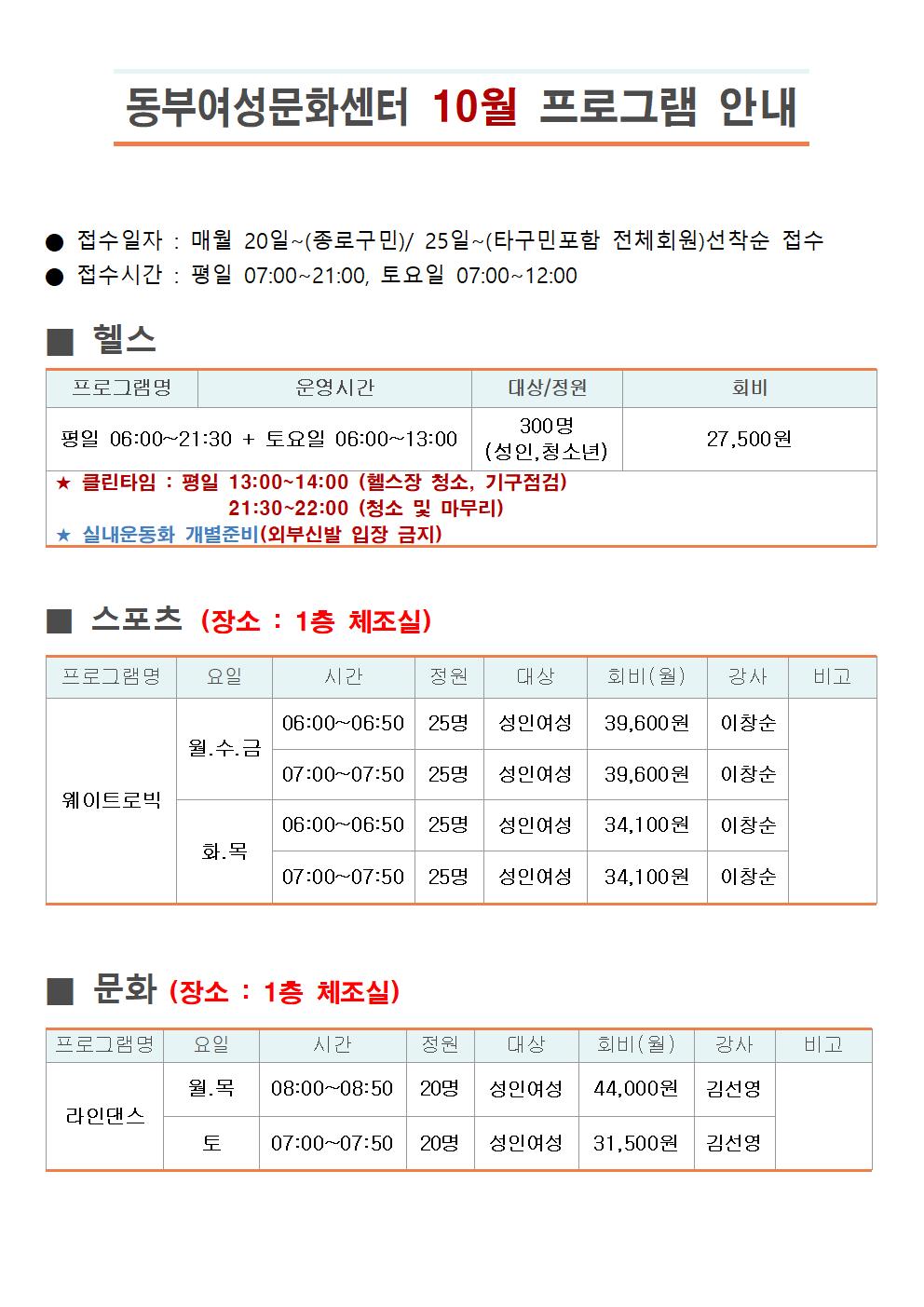 공지사항 게시판 상세 2025. 10월 접수 및 프로그램 안내 시설명 동부문화여성센터 등록일 2025년 9월 18일 13시 6분 조회수 299 파일 10월접수안내(동부여성).jpg [ Size : 1.39MB , Down : 35 ] 미리보기 다운로드 10월접수(동부여성).jpg [ Size : 1.07MB , Down : 36 ] 미리보기 다운로드 동부여성문화센터 25년 10월 프로그램 운영계획001.jpg [ Size : 159.41KB , Down : 34 ] 미리보기 다운로드 목록보기