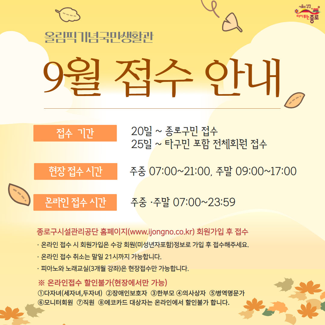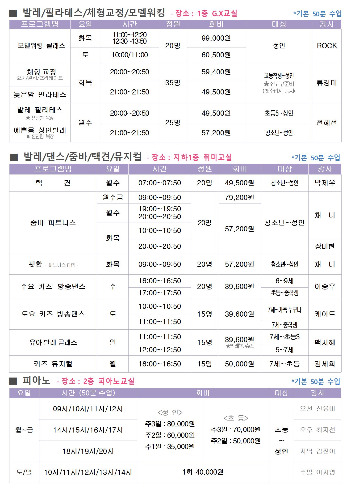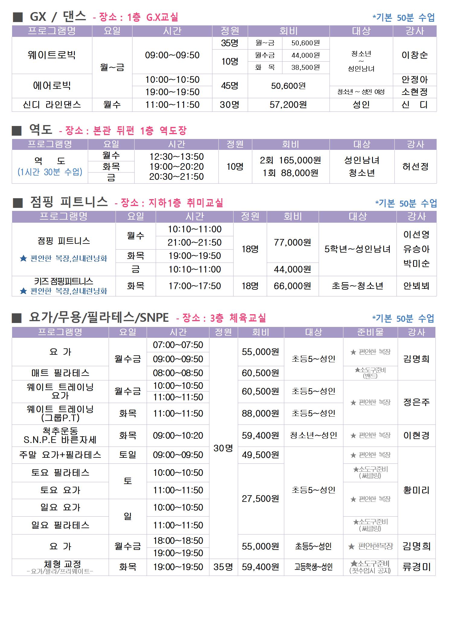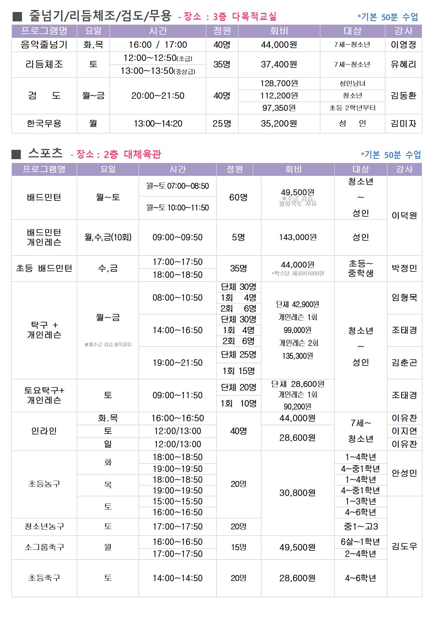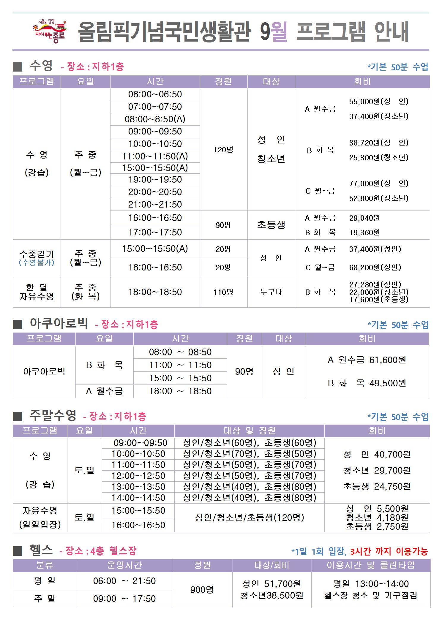 공지사항 게시판 상세 9월 접수 및 프로그램 안내 시설명 올림픽기념국민생활관 등록일 2024년 8월 19일 11시 27분 조회수 1,593 파일 제목을 입력하세요 (7).jpg [ Size : 723.54KB , Down : 161 ] 미리보기 다운로드 생활관팀 9월 운영계획001.jpg [ Size : 395.7KB , Down : 138 ] 미리보기 다운로드 생활관팀 9월 운영계획002.jpg [ Size : 355.93KB , Down : 113 ] 미리보기 다운로드 생활관팀 9월 운영계획003.jpg [ Size : 389.96KB , Down : 107 ] 미리보기 다운로드 생활관팀 9월 운영계획004.jpg [ Size : 362.71KB , Down : 125 ] 미리보기 다운로드 생활관팀 9월 운영계획005.jpg [ Size : 482.68KB , Down : 112 ] 미리보기 다운로드 목록보기
