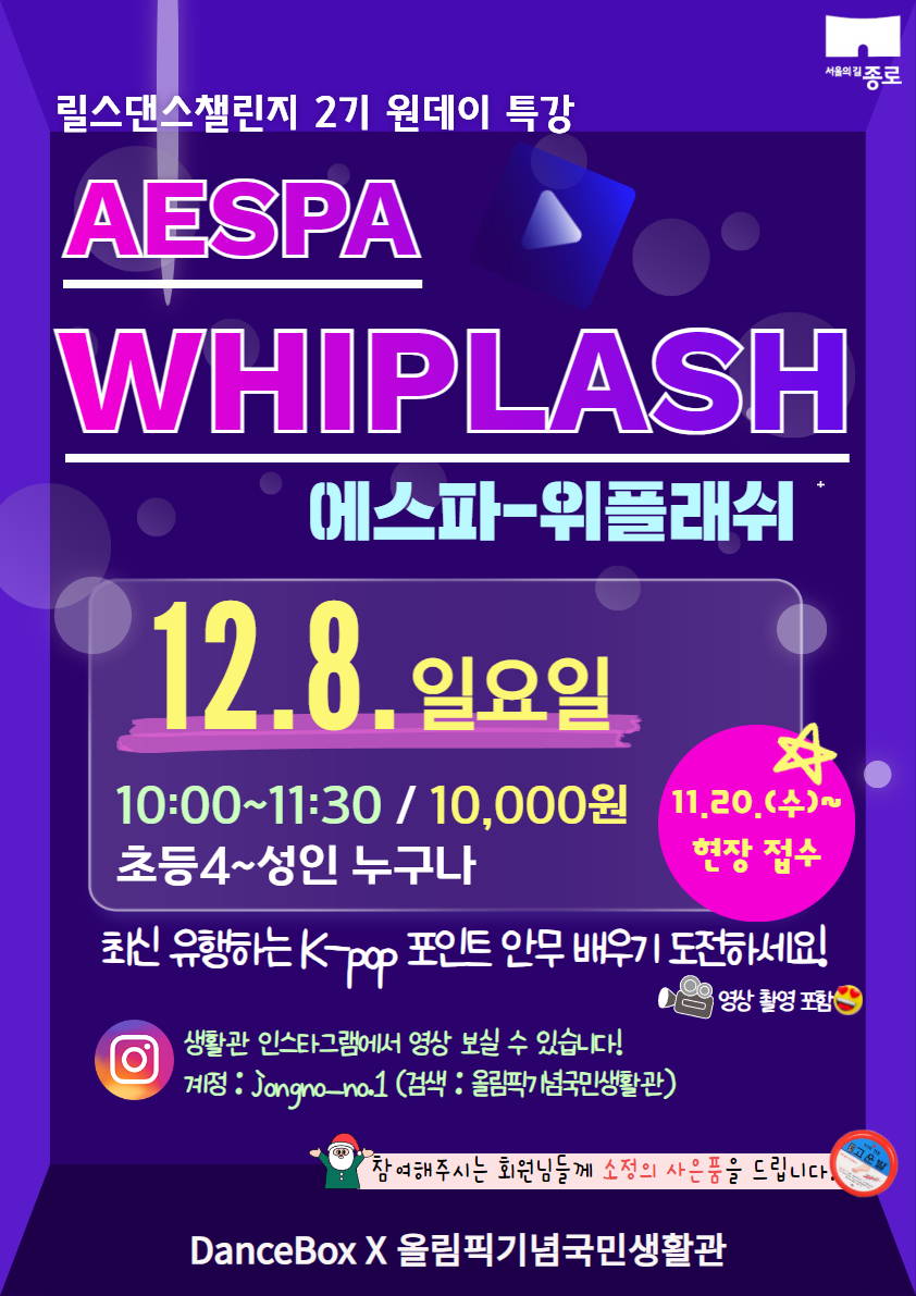 공지사항 게시판 상세 생활관 원데이특강 [ 릴스댄스 챌린지 2기 - 에스파 '위플래쉬' ] 포인트 안무 배우기 시설명 올림픽기념국민생활관 등록일 2024년 11월 11일 16시 59분 조회수 1,133 파일 제목을 입력하세요 (6).jpg [ Size : 629.23KB , Down : 152 ] 미리보기 다운로드 목록보기