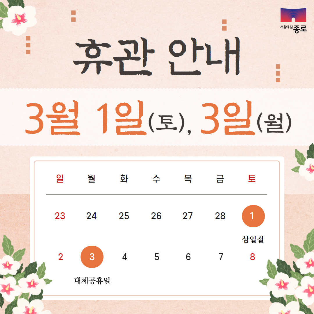 공지사항 게시판 상세 3월 휴관 안내 시설명 종로구시설관리공단 등록일 2025년 2월 18일 10시 39분 조회수 1,946 파일 [복사본] 3월 휴관 안내.jpg [ Size : 938.65KB , Down : 292 ] 미리보기 다운로드 목록보기