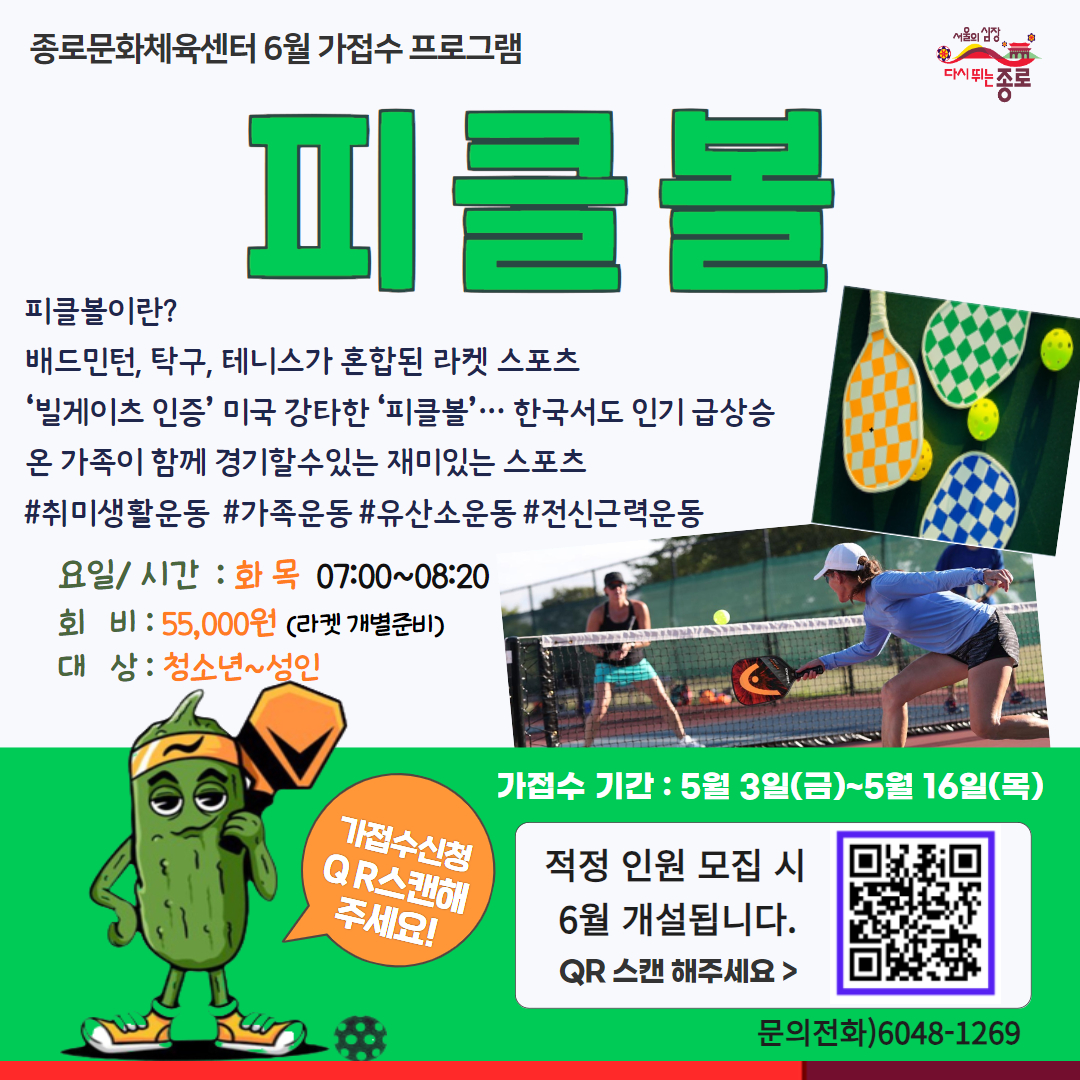 공지사항 게시판 상세 6월 신설 예정 피클볼 프로그램 가접수 안내 시설명 종로문화체육센터 등록일 2024년 5월 3일 14시 53분 조회수 871 6월 신설 #피클볼 프로그램 가접수 중 입니다!! 프로그램 개설 원하시면 꼭 가접수 신청 바랍니다. 아래의 링크 클릭해서 신청바랍니다https://naver.me/54xSniUb 파일 인스타용 (피클볼).jpg [ Size : 880.71KB , Down : 738 ] 미리보기 다운로드 목록보기