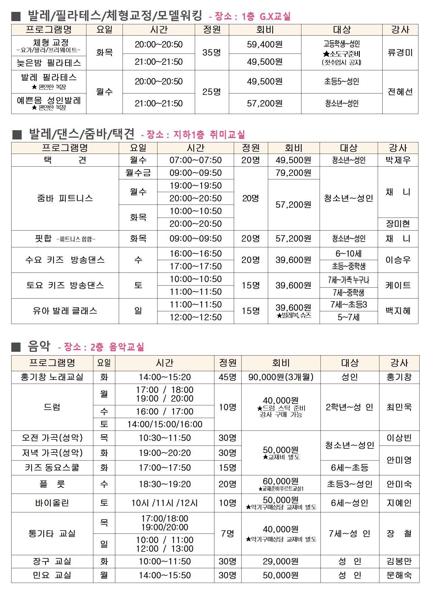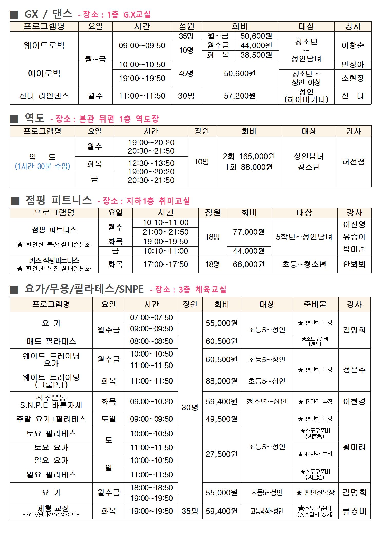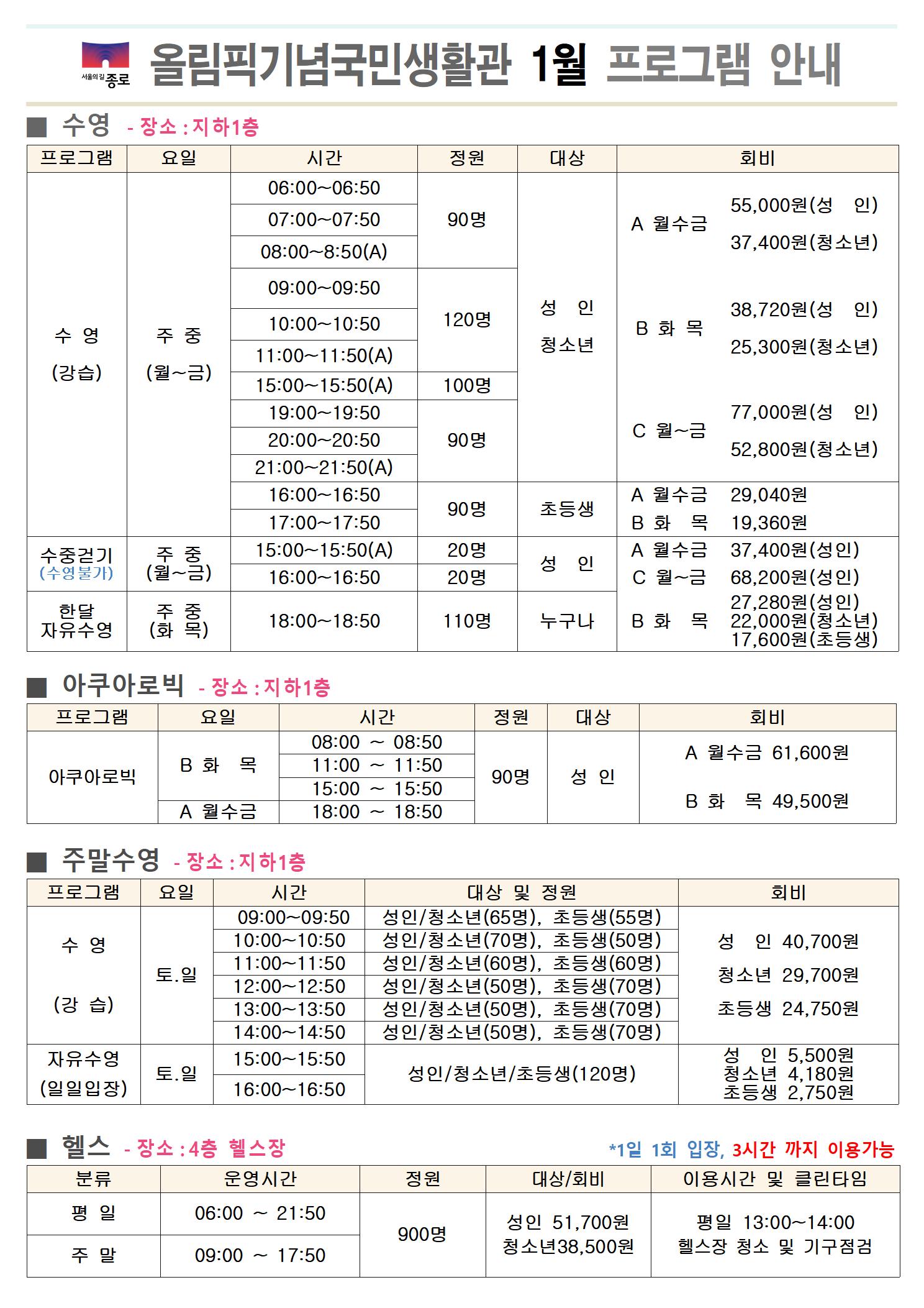 공지사항 게시판 상세 2025. 1월 접수 및 프로그램 안내 시설명 올림픽기념국민생활관 등록일 2024년 12월 18일 17시 37분 조회수 2,427 파일 1월 접수 안내 (1).jpg [ Size : 818.05KB , Down : 215 ] 미리보기 다운로드 생활관팀 2025년 1월 운영 프로그램001.jpg [ Size : 428.13KB , Down : 137 ] 미리보기 다운로드 생활관팀 2025년 1월 운영 프로그램002.jpg [ Size : 383.67KB , Down : 122 ] 미리보기 다운로드 생활관팀 2025년 1월 운영 프로그램003.jpg [ Size : 432.52KB , Down : 106 ] 미리보기 다운로드 생활관팀 2025년 1월 운영 프로그램004.jpg [ Size : 445.29KB , Down : 106 ] 미리보기 다운로드 생활관팀 2025년 1월 운영 프로그램005.jpg [ Size : 422.12KB , Down : 118 ] 미리보기 다운로드 목록보기