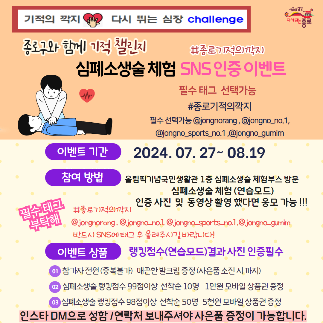 기적의 깍지 다시 뛰는 심장 챌린지 ▶ 제 목: 종로구와 함께 “기적 챌린지” ▶ 기 간: 2024. 7.27.(토) ~ 2024. 8.19.(월) ▶ 대 상: 누구나 참여 가능 ▶ 참여방법: 종로구 올림픽기념국민생활관 1층 심폐소생술 체험부스 방문^^ 심폐소생술(연습모드) 체험 후, 인증사진 또는 동영상을 아래 해시태그와 함께 인스타에 게시 - (필수) #종로기적의깍지 (필수 선택 가능)@jongnorang,@jongno_no.1, @jongno_sports_no.1 ,@jongno_gumim ▶ 이벤트 상품(중복 불가) 참가자 전원 매끈한 발크림 증정 (사은품 소진 시 까지) · 심폐소생술(연습모드) 랭킹점수 99점이상 1만원 모바일 상품권 증정: 선착순 10명 · 심폐소생술(연습모드) 랭킹점수 98점이상 5천원 모바일 상품권 증정: 선착순 50명 ▶ 당첨자 발표: 24.8.28(수) * 종로구시설관리공단 홈페이지 및 인스타그램 공지 ▶ 상품지급: 당첨자 문자발송 (모바일 상품권증정) ★참여 시 디엠으로 성함 연락처 보내주셔야 증정이 가능 합니다★ ▶ 문 의 처: 종로구시설관리공단 고객지원부 ☎ 02-6048-1269 #종로기적의깍지 #종로구 #종로구시설관리공단 #심폐소생술체험 #기적챌린지 #많관부  |
