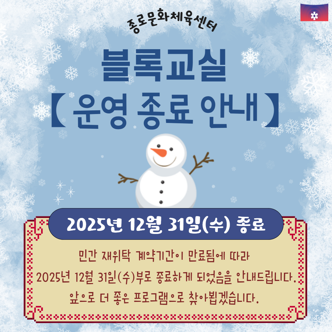 공지사항 게시판 상세 공지 종로문화체육센터 블록교실 운영 종료(2025.12.31.) 시설명 종로문화체육센터 등록일 2025년 12월 4일 9시 16분 조회수 140 파일 블록교실운영종료.jpg [ Size : 938.65KB , Down : 14 ] 미리보기 다운로드 목록보기