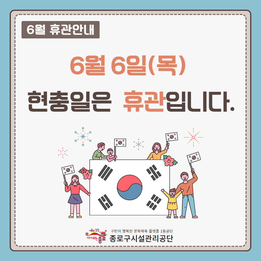 공지사항 게시판 상세 6월 휴관 안내 시설명 종로구시설관리공단 등록일 2024년 5월 17일 15시 36분 조회수 1,627 파일 [복사본] 제목을 입력하세요.jpg [ Size : 346.53KB , Down : 197 ] 미리보기 다운로드 목록보기
