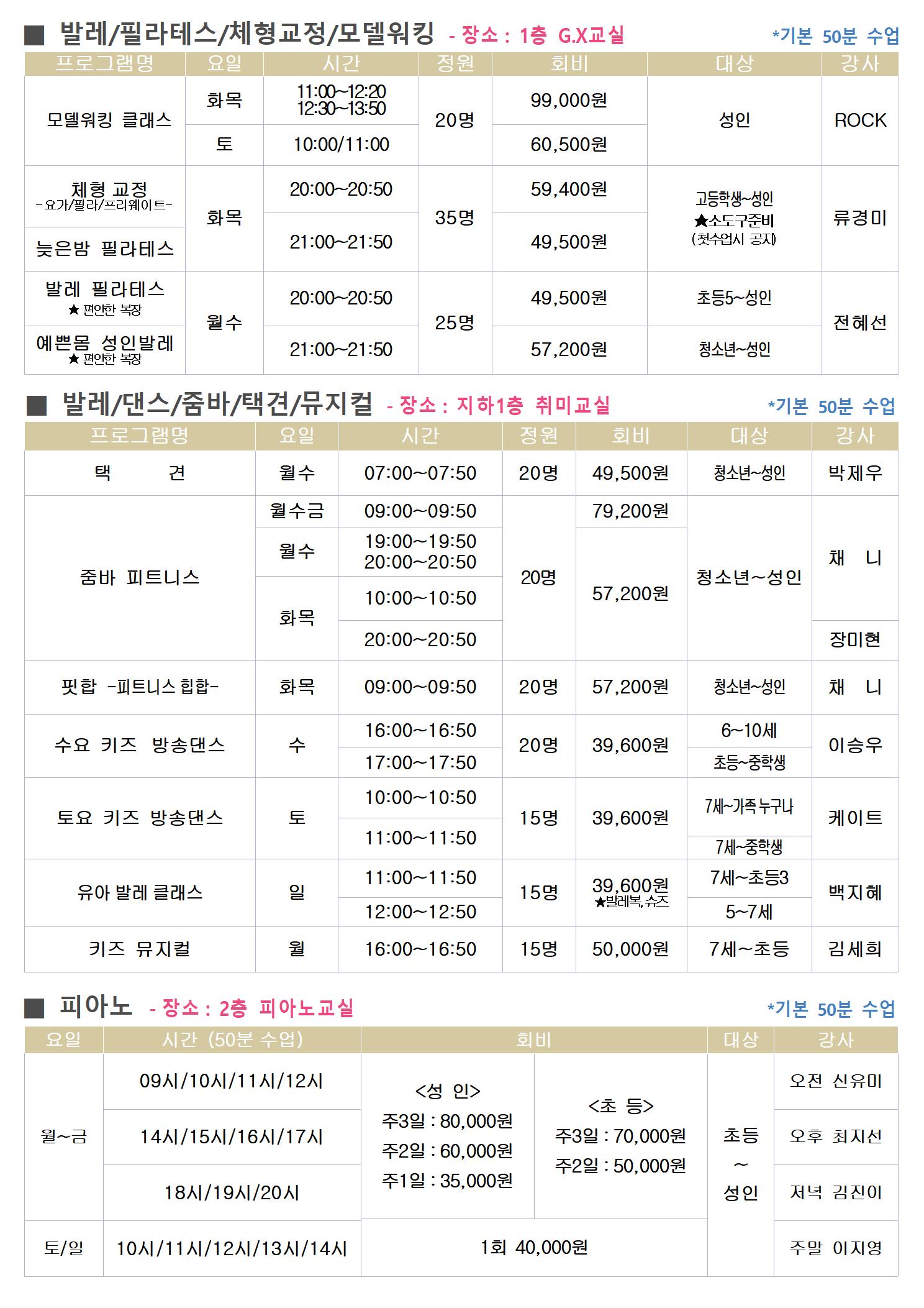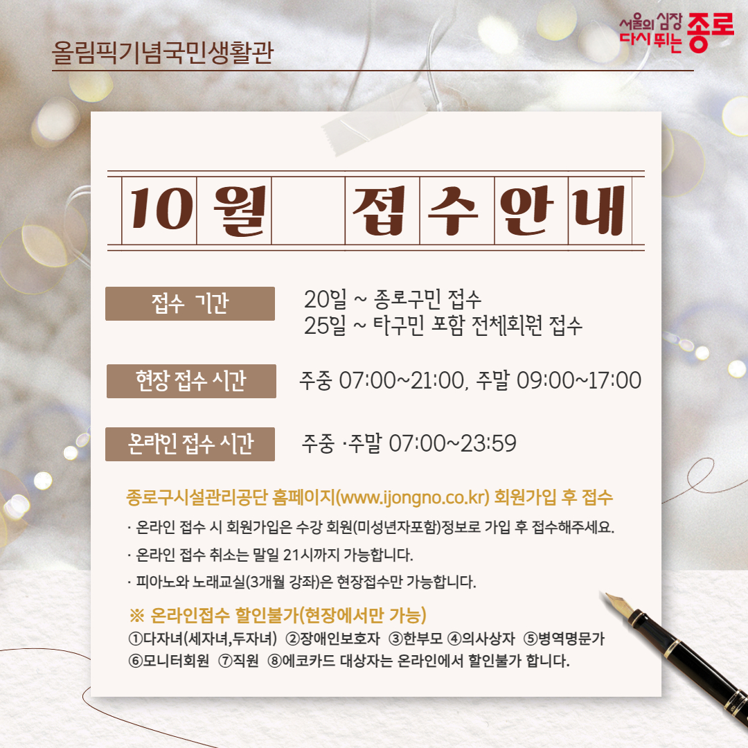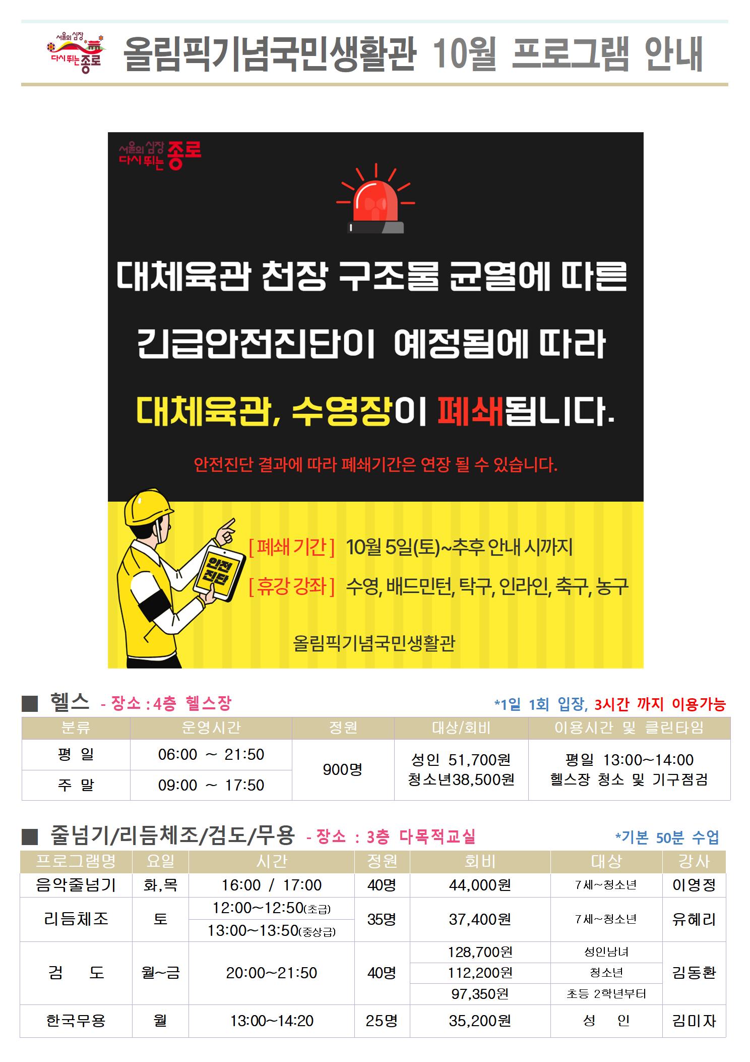 공지사항 게시판 상세 10월 접수 및 프로그램 안내 시설명 올림픽기념국민생활관 등록일 2024년 9월 13일 10시 5분 조회수 1,767 파일 10월 프로그램접수 안내.jpg [ Size : 868.15KB , Down : 197 ] 미리보기 다운로드 생활관팀 10월 운영계획003.jpg [ Size : 392.86KB , Down : 130 ] 미리보기 다운로드 생활관팀 10월 운영계획004.jpg [ Size : 361.47KB , Down : 149 ] 미리보기 다운로드 생활관팀 10월 운영계획005.jpg [ Size : 484.7KB , Down : 132 ] 미리보기 다운로드 생활관팀 10월 운영계획001.jpg [ Size : 305.74KB , Down : 121 ] 미리보기 다운로드 목록보기