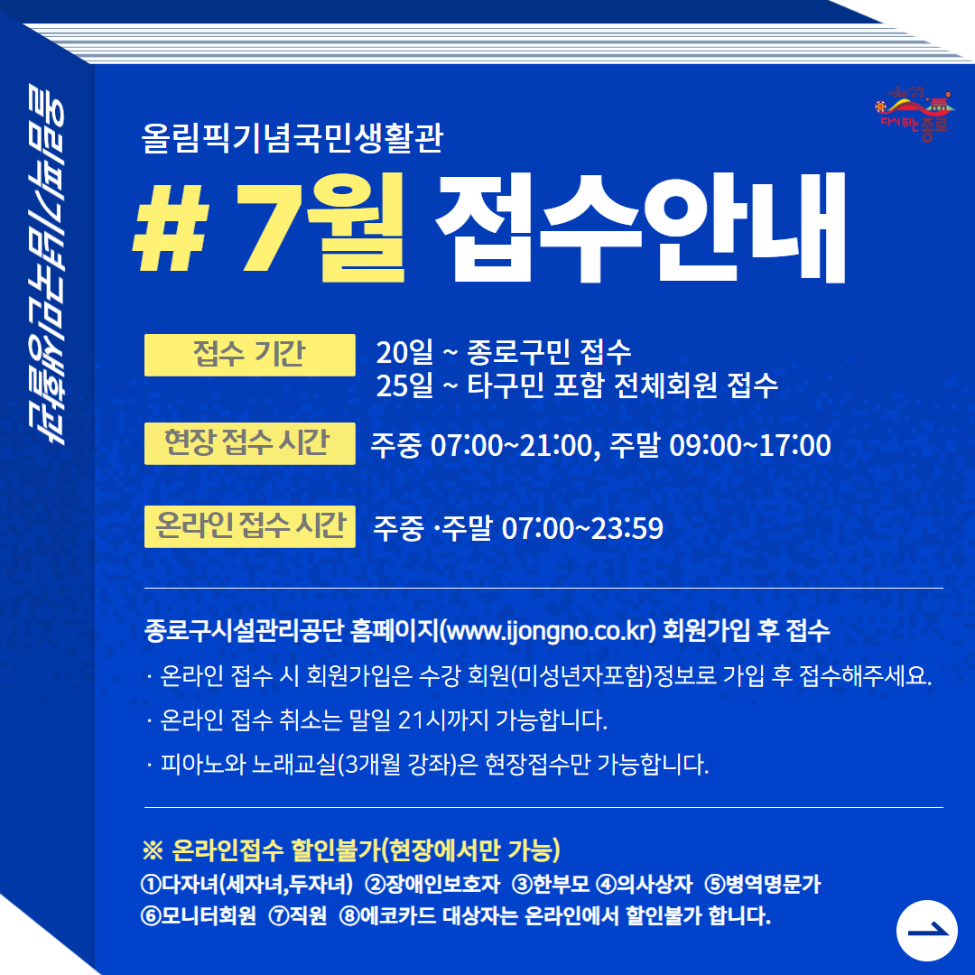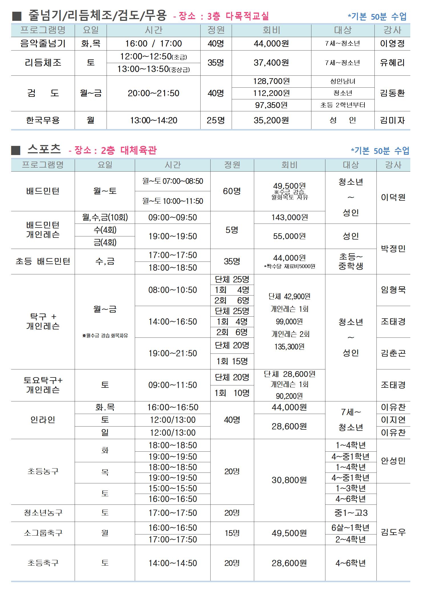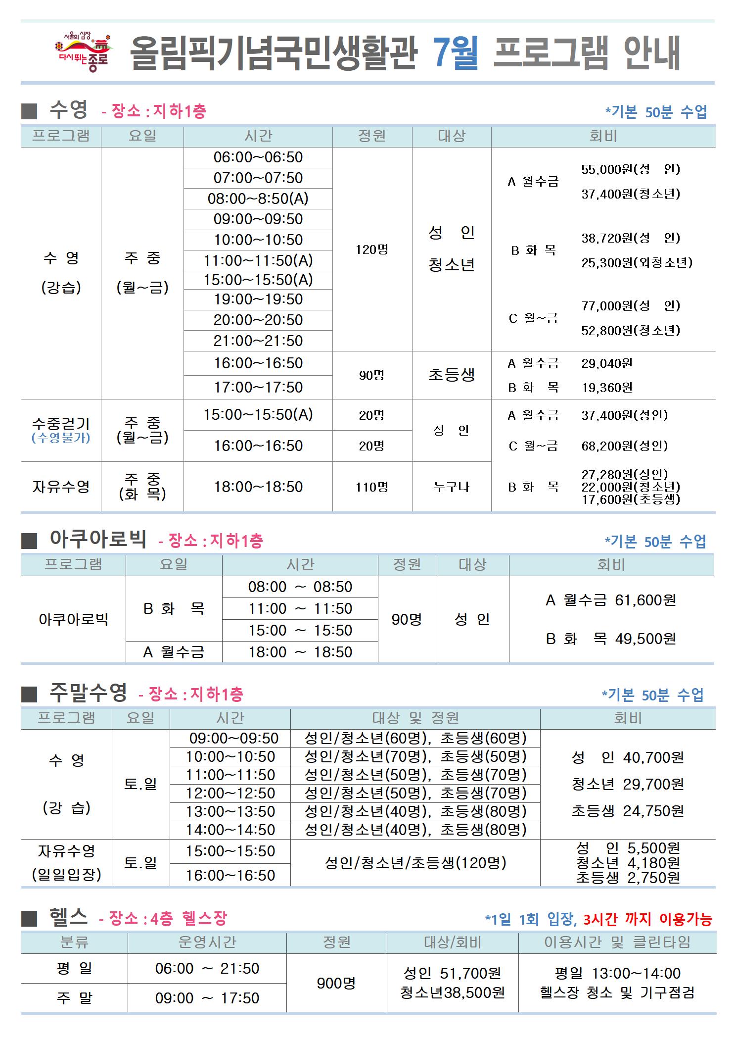 공지사항 게시판 상세 7월 접수 및 프로그램 안내 시설명 올림픽기념국민생활관 등록일 2024년 6월 19일 11시 15분 조회수 2,097 파일 제목을 입력하세요 (14).jpg [ Size : 761.02KB , Down : 197 ] 미리보기 다운로드 생활관팀 7월 운영계획 (게시용)001.jpg [ Size : 400.5KB , Down : 194 ] 미리보기 다운로드 생활관팀 7월 운영계획 (게시용)002.jpg [ Size : 364.8KB , Down : 184 ] 미리보기 다운로드 생활관팀 7월 운영계획 (게시용)003.jpg [ Size : 418.96KB , Down : 175 ] 미리보기 다운로드 생활관팀 7월 운영계획 (게시용)004.jpg [ Size : 370.07KB , Down : 178 ] 미리보기 다운로드 생활관팀 7월 운영계획 (게시용)005.jpg [ Size : 493.62KB , Down : 172 ] 미리보기 다운로드 목록보기
