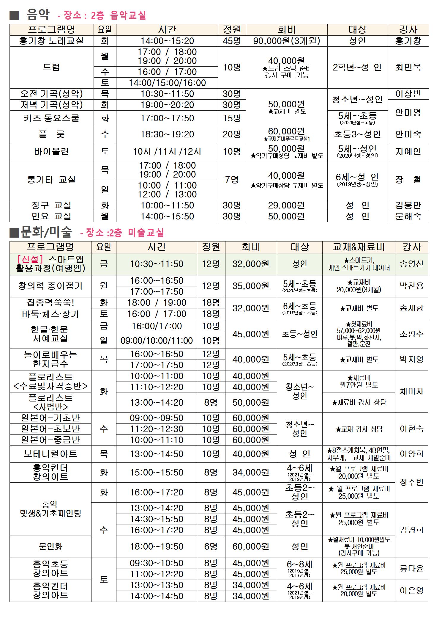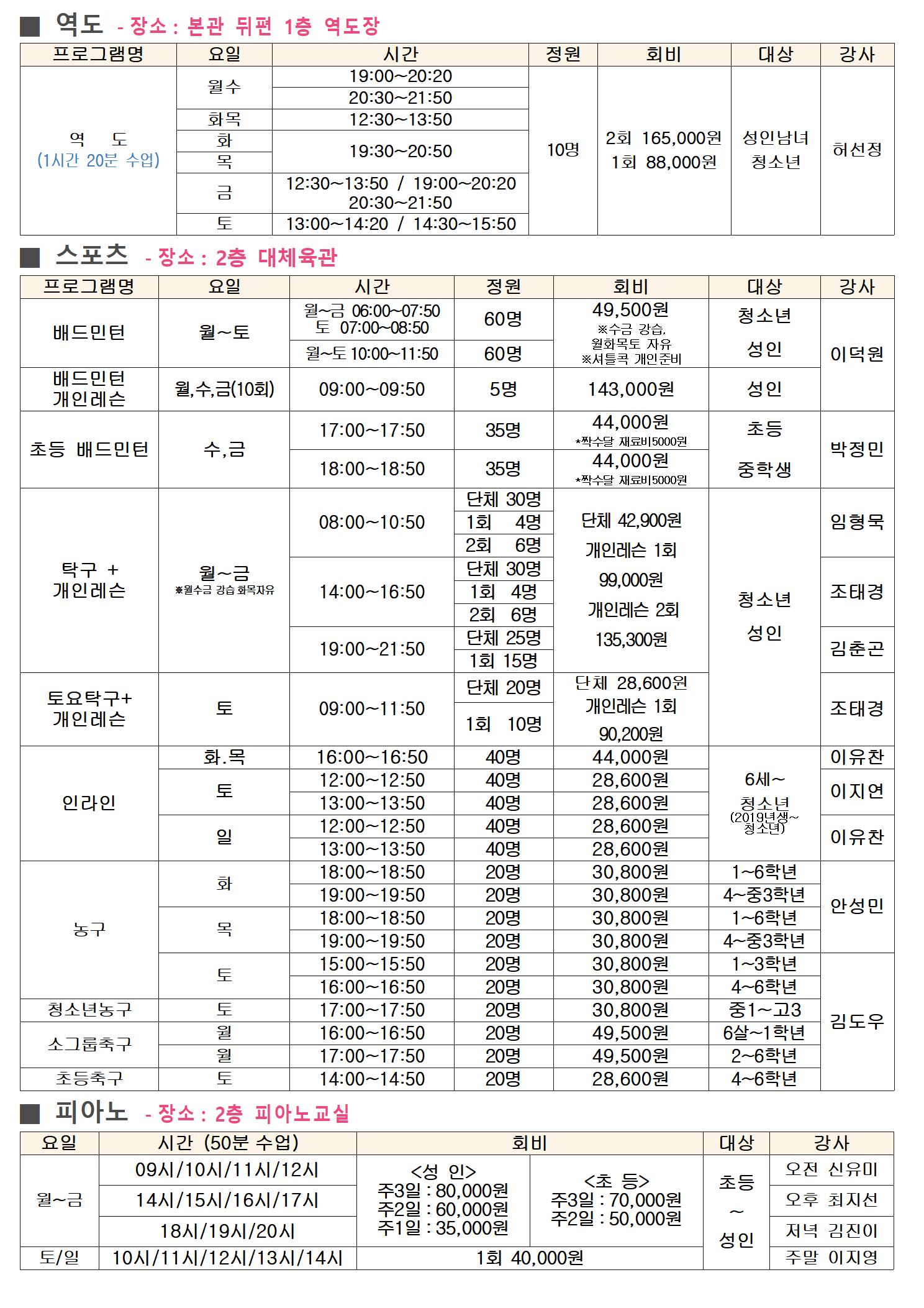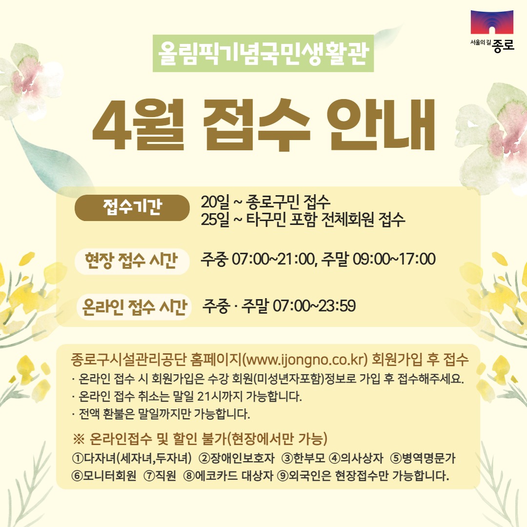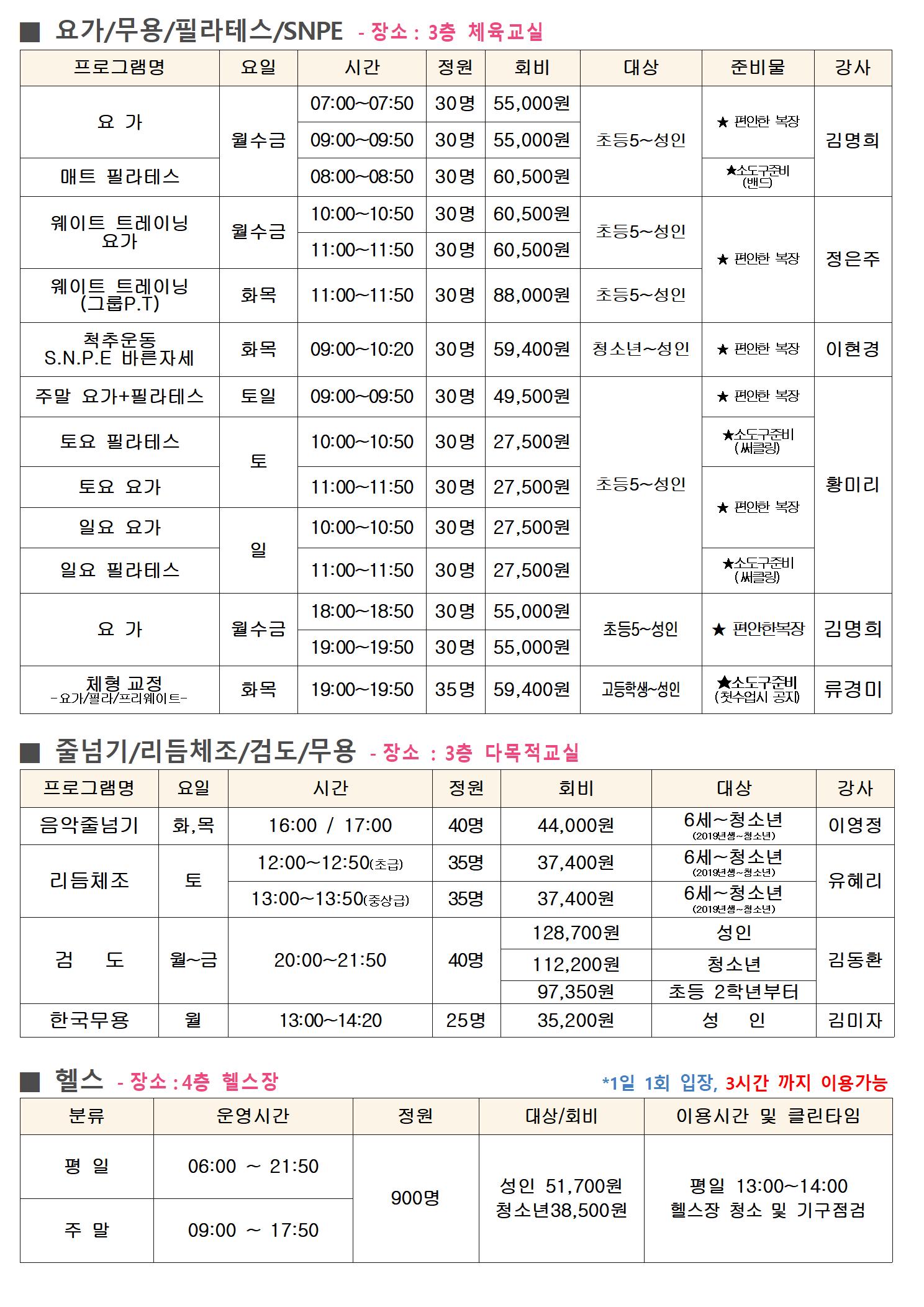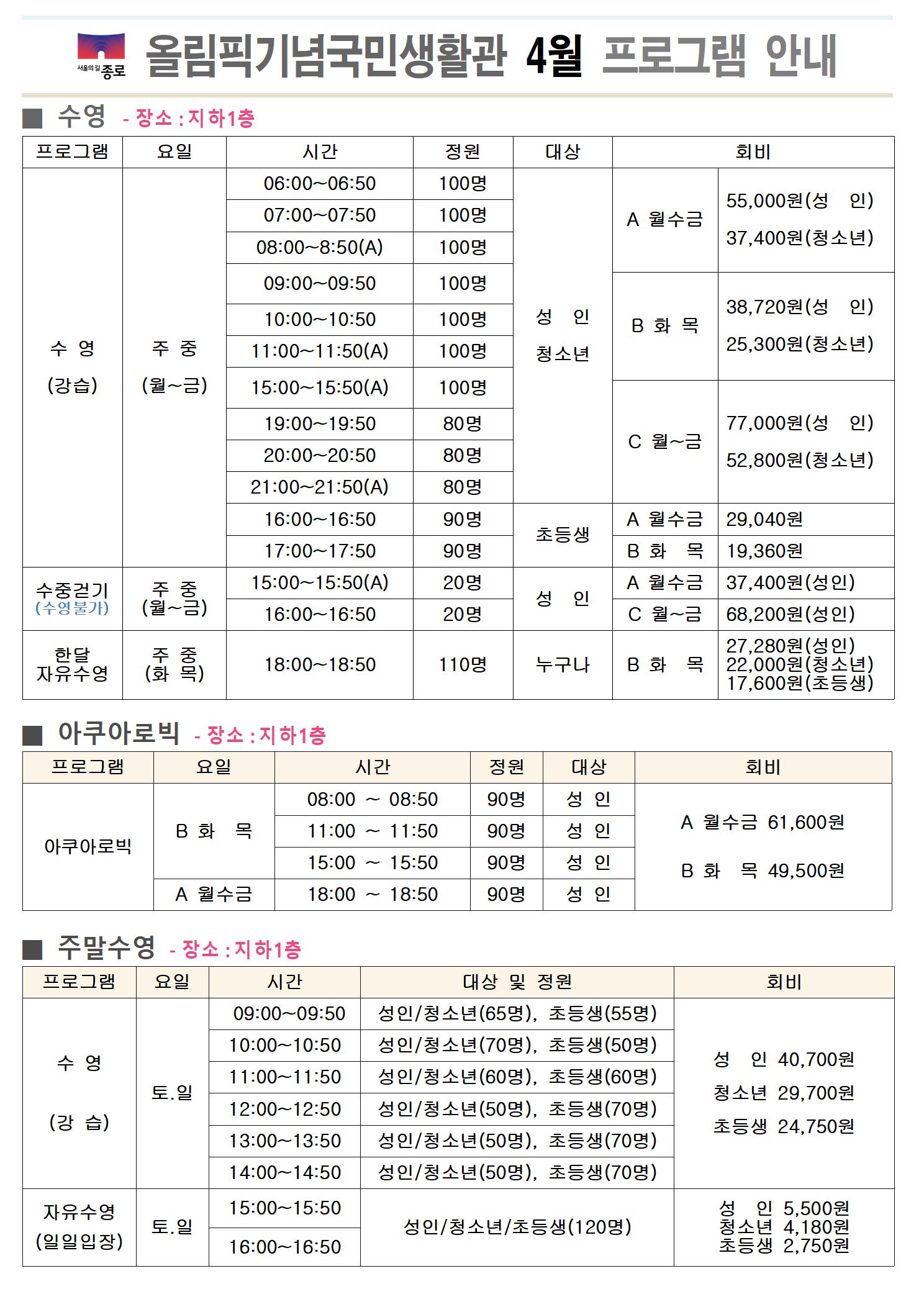 공지사항 게시판 상세 2025. 4월 접수 및 프로그램 안내 시설명 올림픽기념국민생활관 등록일 2025년 3월 18일 13시 56분 조회수 2,910 파일 제목을 입력하세요.jpg [ Size : 616.34KB , Down : 282 ] 미리보기 다운로드 생활관팀 2025년 4월 운영 프로그램001.jpg [ Size : 408.42KB , Down : 264 ] 미리보기 다운로드 생활관팀 2025년 4월 운영 프로그램002.jpg [ Size : 448.7KB , Down : 250 ] 미리보기 다운로드 생활관팀 2025년 4월 운영 프로그램003.jpg [ Size : 471.36KB , Down : 248 ] 미리보기 다운로드 생활관팀 2025년 4월 운영 프로그램004.jpg [ Size : 571.37KB , Down : 249 ] 미리보기 다운로드 생활관팀 2025년 4월 운영 프로그램005.jpg [ Size : 417.81KB , Down : 265 ] 미리보기 다운로드 목록보기