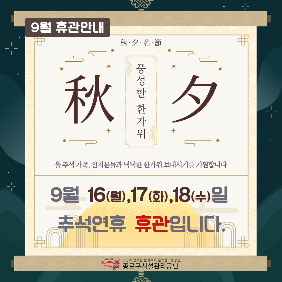 공지사항 게시판 상세 9월 휴관 안내 시설명 종로구시설관리공단 등록일 2024년 8월 19일 13시 16분 조회수 1,800 파일 추석 휴관안내 인스타.jpg [ Size : 644.13KB , Down : 189 ] 미리보기 다운로드 목록보기