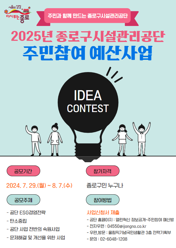 공지사항 게시판 상세 2025년 종로구시설관리공단 주민참여 예산사업 시설명 종로구시설관리공단 등록일 2024년 7월 26일 9시 38분 조회수 550 파일 홍보물.jpg [ Size : 302.92KB , Down : 144 ] 미리보기 다운로드 목록보기