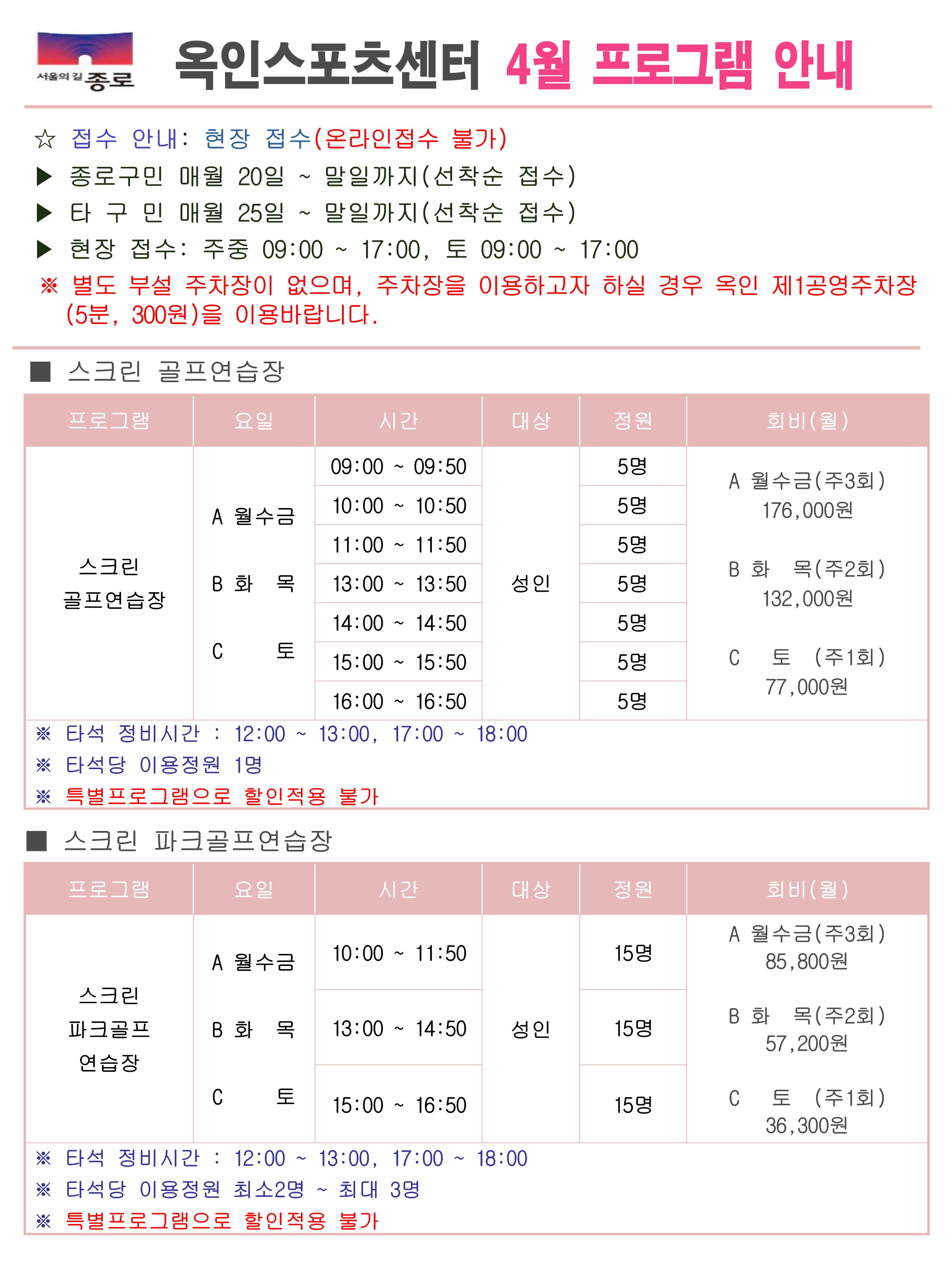 공지사항 게시판 상세 2026.4월 접수 및 프로그램 안내 시설명 옥인스포츠센터 등록일 2026년 3월 17일 16시 41분 조회수 374 파일 홈페이지 4월 접수 및 프로그램 안내 4.jpg [ Size : 1.78MB , Down : 20 ] 미리보기 다운로드 홈페이지 4월 접수 및 프로그램 안내 표지-옥인.jpg [ Size : 1.19MB , Down : 16 ] 미리보기 다운로드 옥인스포츠센터 4월 운영프로그램1.jpeg [ Size : 778.38KB , Down : 33 ] 미리보기 다운로드 옥인스포츠센터 4월 운영프로그램2.jpeg [ Size : 533.69KB , Down : 21 ] 미리보기 다운로드 목록보기
