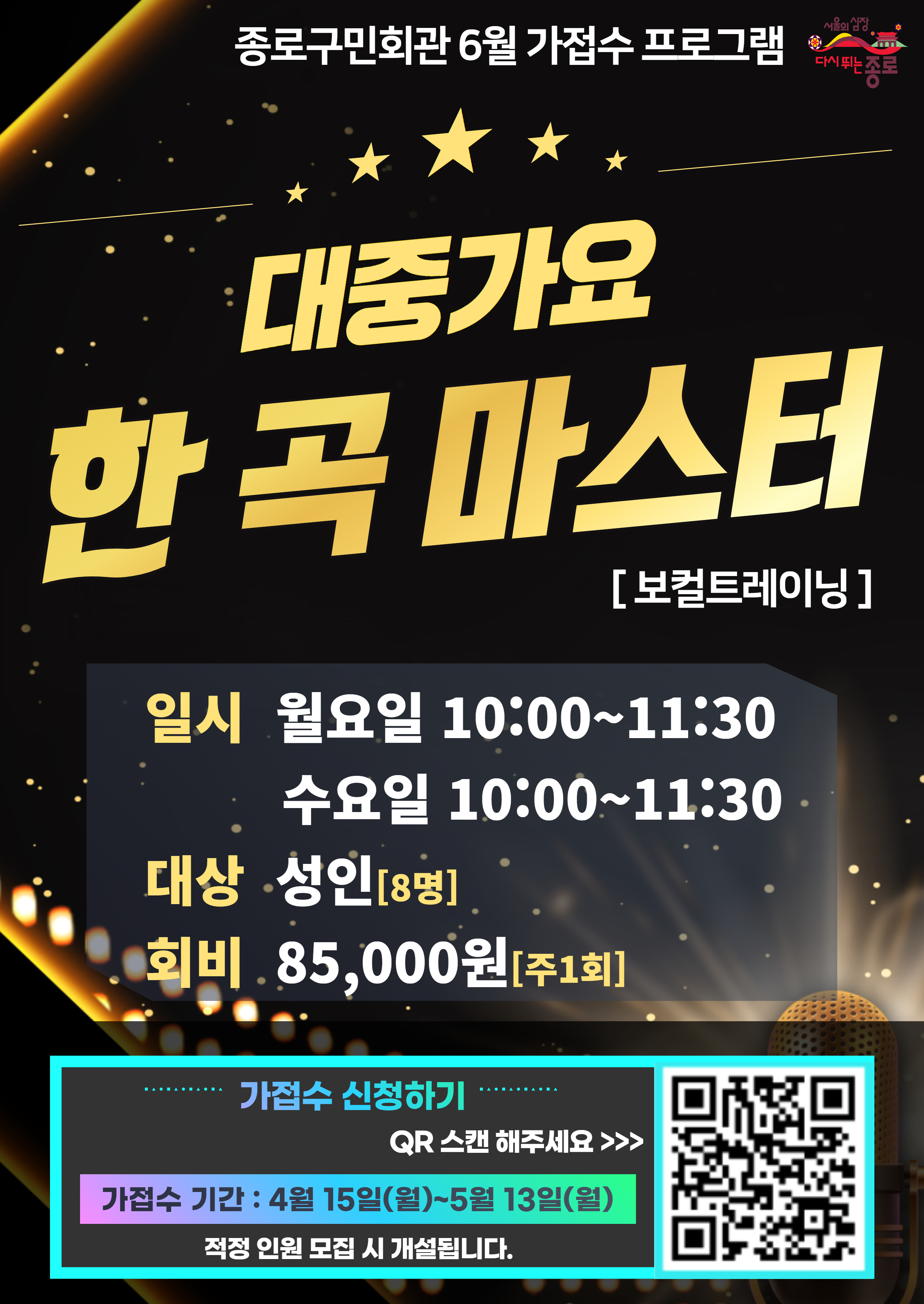 공지사항 게시판 상세 6월 개설 예정 <대중가요 한 곡 마스터> 가접수 시설명 종로구민회관 등록일 2024년 4월 12일 17시 30분 조회수 755 파일 구민회관팀 6월 대중가요 한 곡 마스터 가접수 안내지.jpg [ Size : 2.47MB , Down : 633 ] 미리보기 다운로드 목록보기
