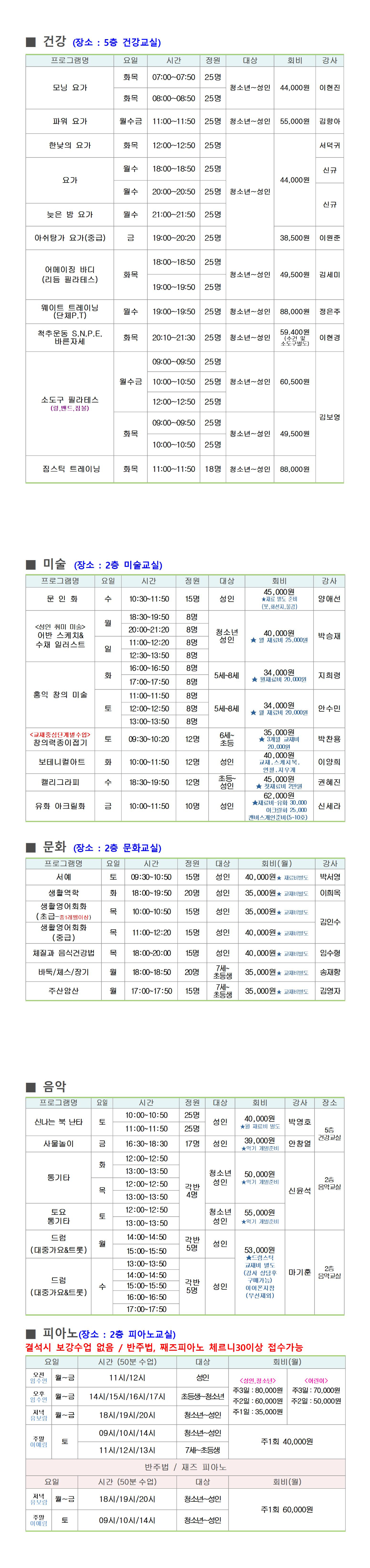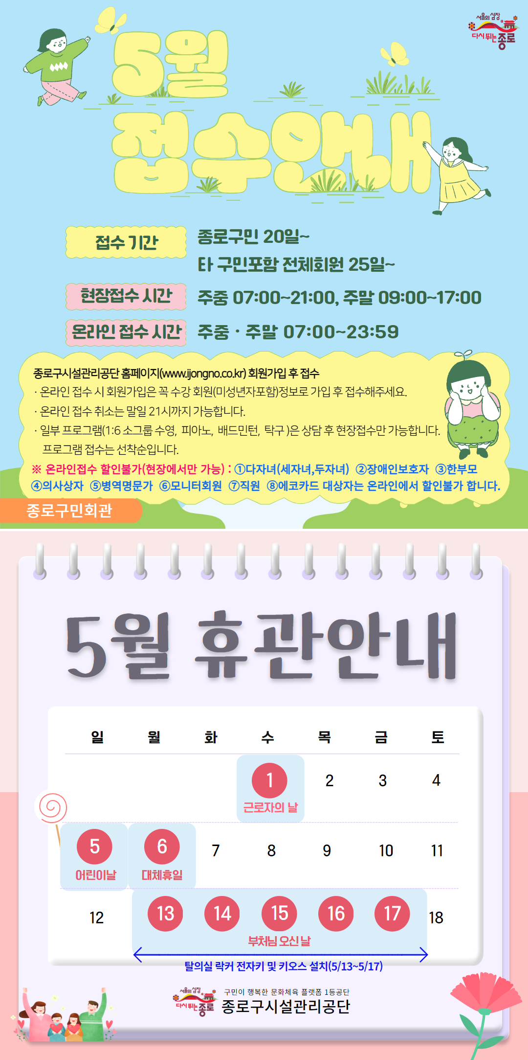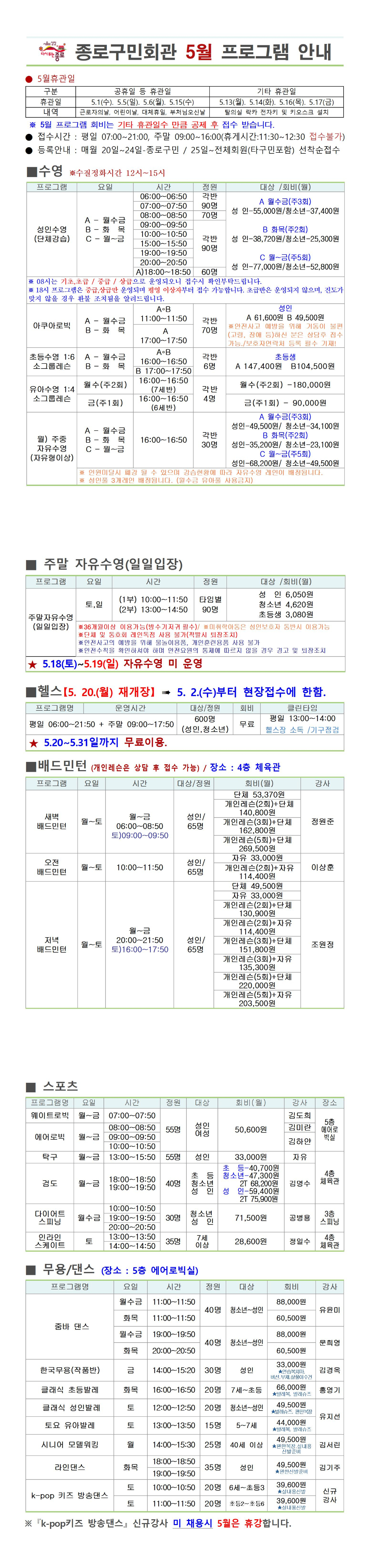 공지사항 게시판 상세 5월 프로그램 및 휴관 안내 시설명 종로구민회관 등록일 2024년 4월 18일 11시 2분 조회수 2,274 파일 제목을 입력하세요 (26).jpg [ Size : 2.81MB , Down : 845 ] 미리보기 다운로드 제목을 입력하세요 (27).jpg [ Size : 2.19MB , Down : 695 ] 미리보기 다운로드 제목을 입력하세요 (36).jpg [ Size : 1.18MB , Down : 653 ] 미리보기 다운로드 목록보기