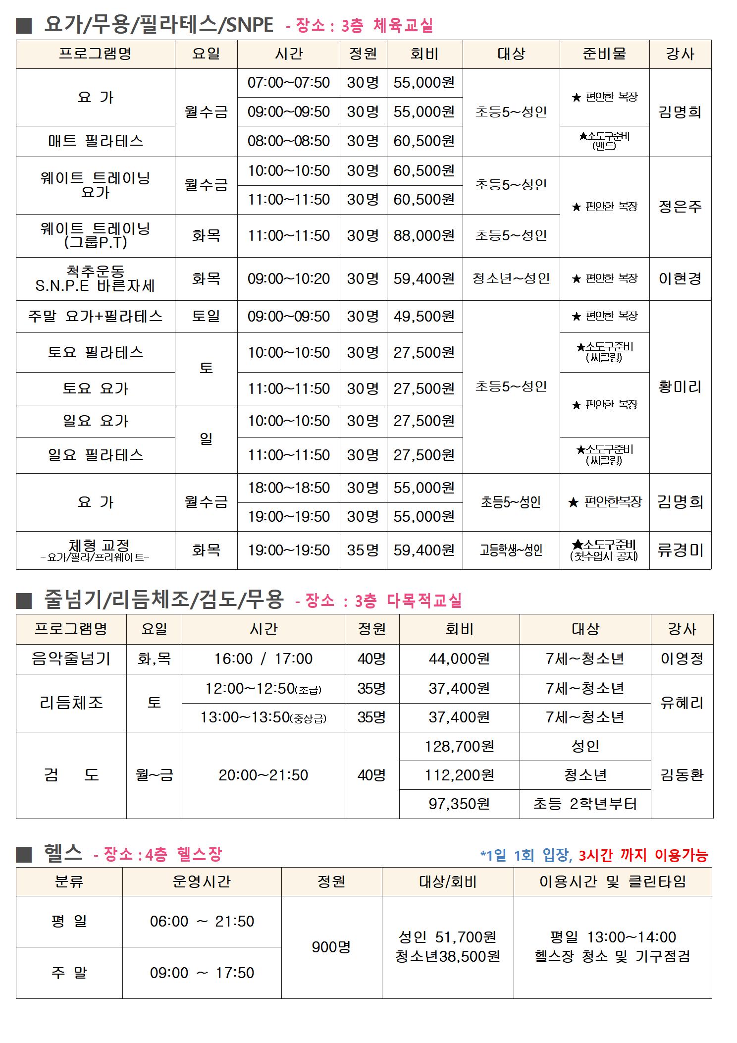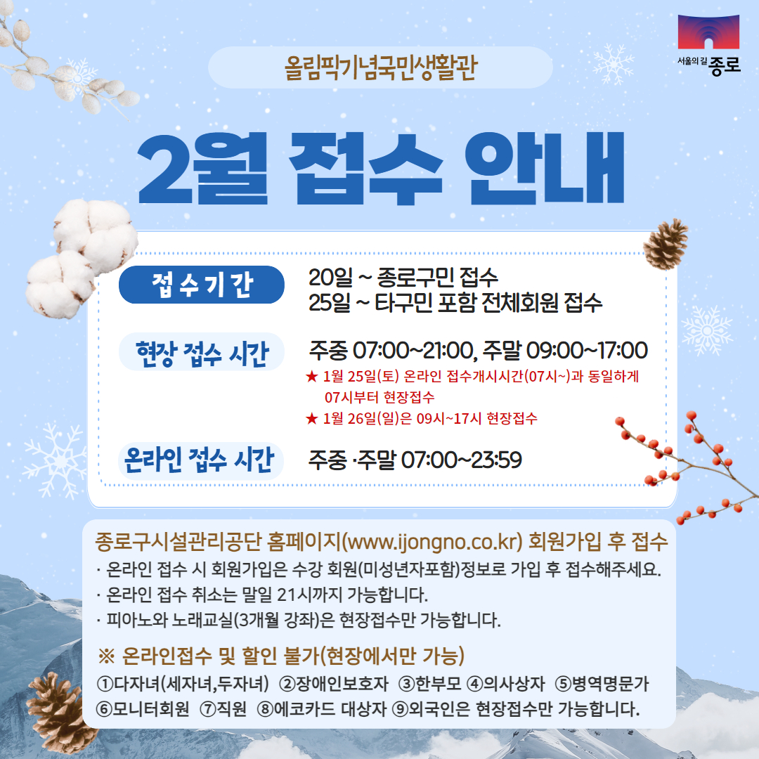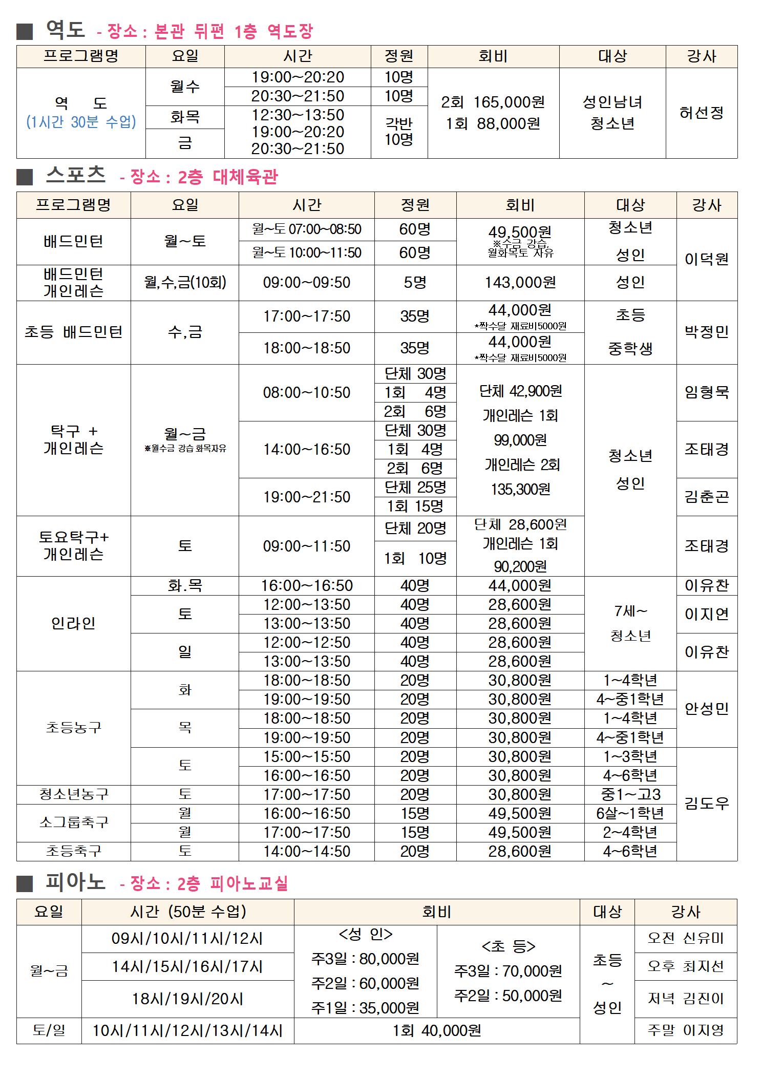 공지사항 게시판 상세 2025. 2월 접수 및 프로그램 안내 시설명 올림픽기념국민생활관 등록일 2025년 1월 17일 9시 49분 조회수 1,584 파일 생활관 2월001.jpg [ Size : 408.71KB , Down : 143 ] 미리보기 다운로드 생활관 2월002.jpg [ Size : 449.14KB , Down : 127 ] 미리보기 다운로드 생활관 2월003.jpg [ Size : 461.33KB , Down : 124 ] 미리보기 다운로드 생활관 2월004.jpg [ Size : 539.93KB , Down : 123 ] 미리보기 다운로드 생활관 2월005.jpg [ Size : 399.7KB , Down : 132 ] 미리보기 다운로드 2월 접수 안내.jpg [ Size : 854.92KB , Down : 154 ] 미리보기 다운로드 목록보기