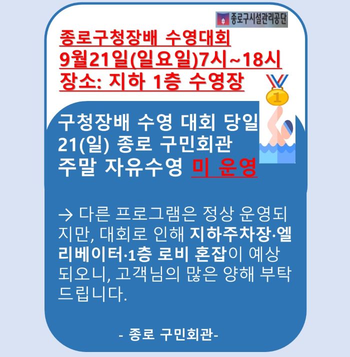 공지사항 게시판 상세 종로구민회관 주말 자유수영 미운영 안내 시설명 종로구민회관 등록일 2025년 9월 3일 15시 38분 조회수 886 파일 구민회관 팝업 요청 안내문1.jpg [ Size : 80.53KB , Down : 58 ] 미리보기 다운로드 목록보기