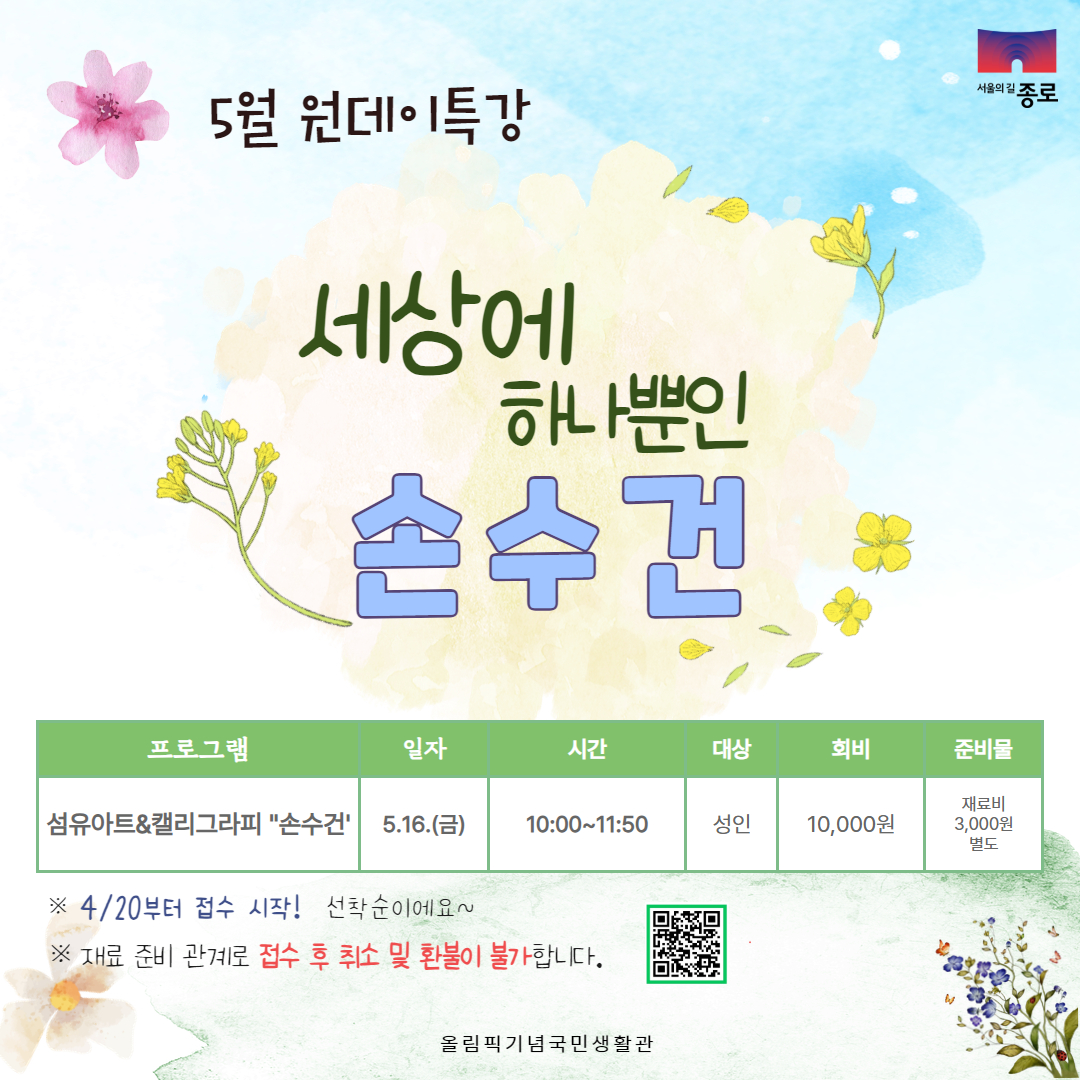 공지사항 게시판 상세 생활관 5월 특강 운영 시설명 올림픽기념국민생활관 등록일 2025년 4월 21일 8시 28분 조회수 1,260 파일 5월특강(인스타) 1.jpg [ Size : 1MB , Down : 99 ] 미리보기 다운로드 5월특강(인스타) 2.jpg [ Size : 829KB , Down : 82 ] 미리보기 다운로드 5월특강(인스타) 3.jpg [ Size : 935.02KB , Down : 90 ] 미리보기 다운로드 목록보기