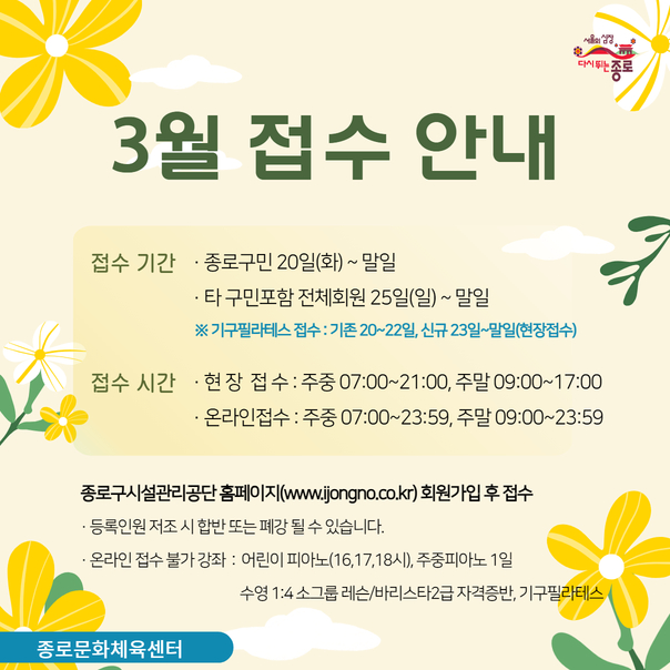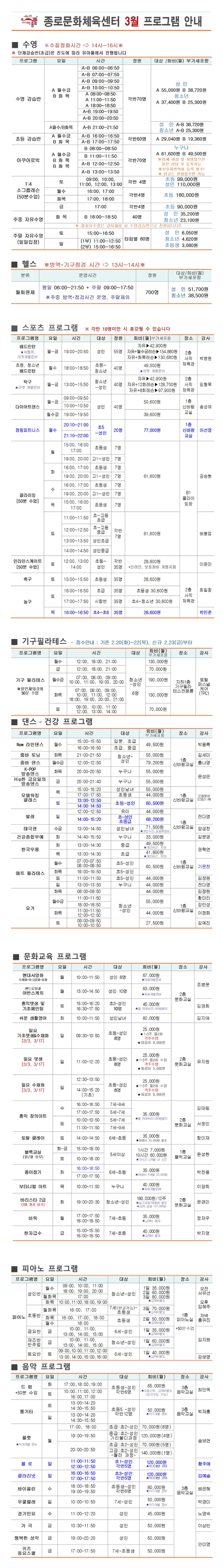 공지사항 게시판 상세 3월 접수 및 프로그램 안내 시설명 종로문화체육센터 등록일 2024년 2월 29일 17시 23분 조회수 524 파일 홈페이지 604 (1).jpg [ Size : 269.35KB , Down : 695 ] 미리보기 다운로드 홈페이지 이어진 안내지.jpg [ Size : 1.74MB , Down : 645 ] 미리보기 다운로드 목록보기