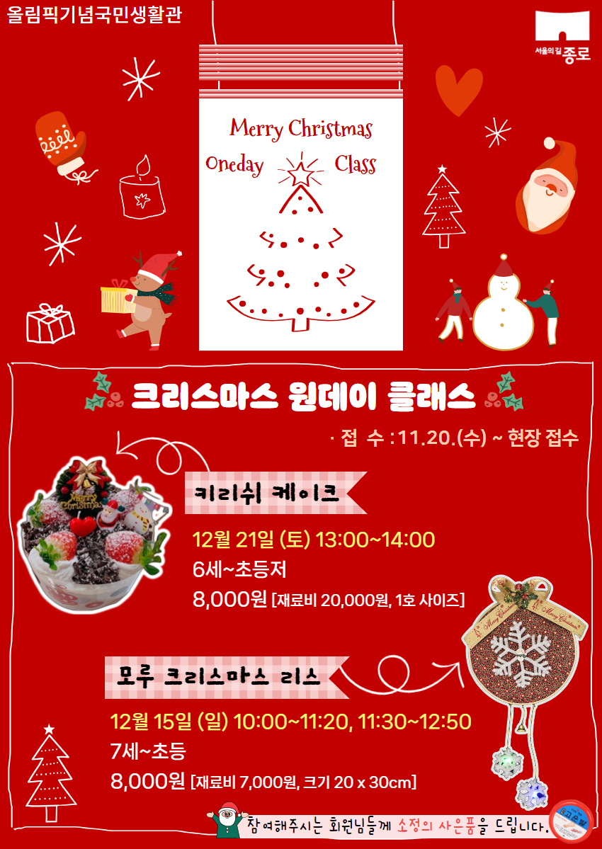 공지사항 게시판 상세 생활관 [크리스마스 원데이 클래스] 시설명 올림픽기념국민생활관 등록일 2024년 11월 7일 10시 12분 조회수 1,196 파일 크리스마스 원데이 클래스 안내지.jpg [ Size : 721.37KB , Down : 158 ] 미리보기 다운로드 목록보기
