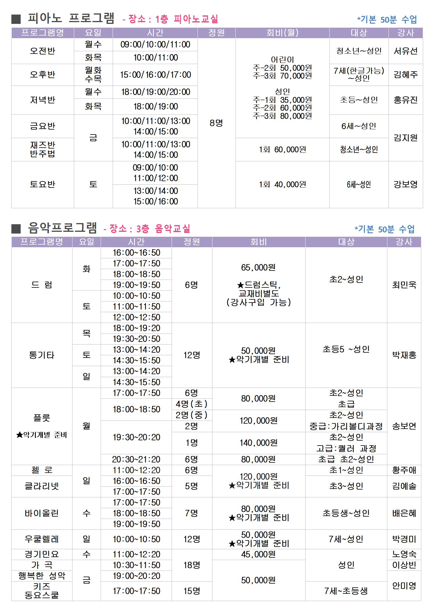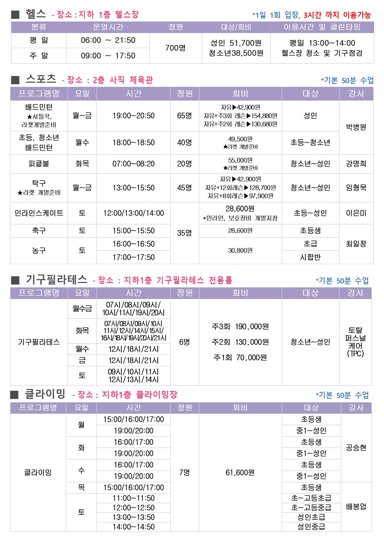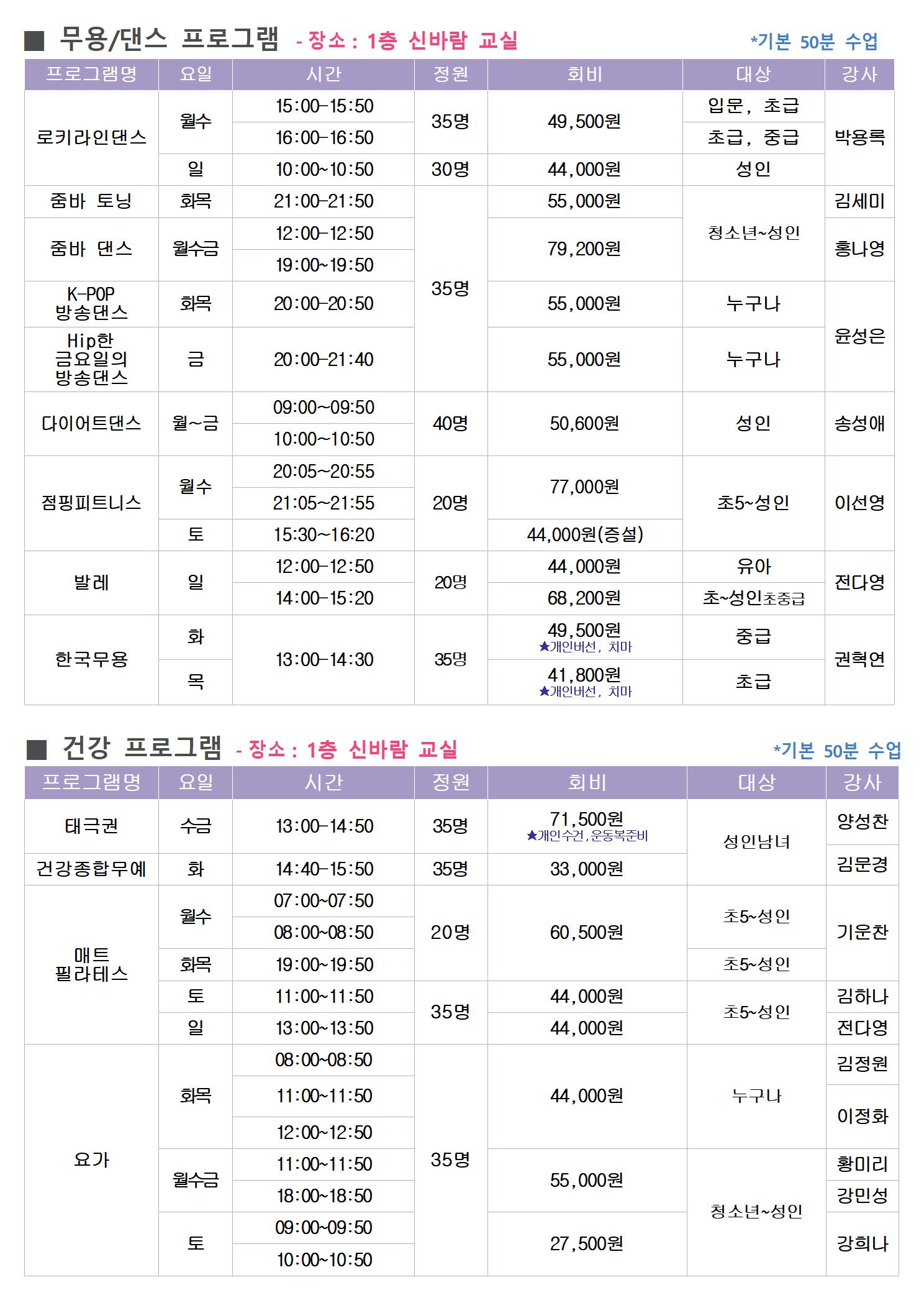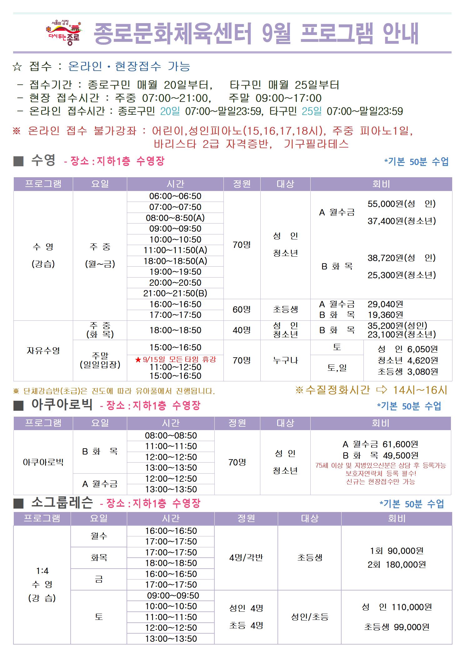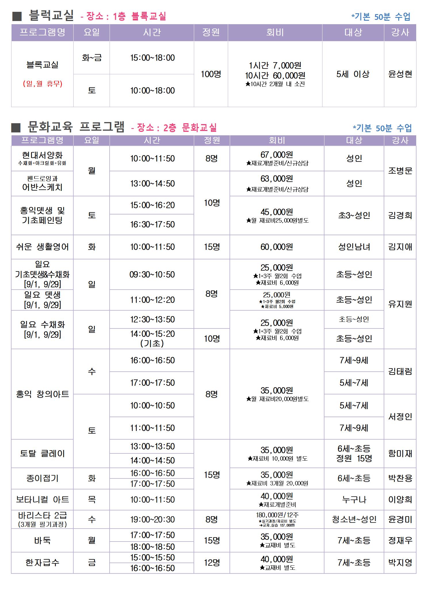 공지사항 게시판 상세 9월 접수 및 프로그램 안내 시설명 종로문화체육센터 등록일 2024년 8월 19일 13시 12분 조회수 2,633 파일 제목을 입력하세요 (9).jpg [ Size : 710.85KB , Down : 158 ] 미리보기 다운로드 문화체육센터 9월 운영프로그램001.jpg [ Size : 383.62KB , Down : 150 ] 미리보기 다운로드 문화체육센터 9월 운영프로그램002.jpg [ Size : 371.88KB , Down : 115 ] 미리보기 다운로드 문화체육센터 9월 운영프로그램003.jpg [ Size : 347.17KB , Down : 119 ] 미리보기 다운로드 문화체육센터 9월 운영프로그램004.jpg [ Size : 358.15KB , Down : 132 ] 미리보기 다운로드 문화체육센터 9월 운영프로그램005.jpg [ Size : 390.62KB , Down : 119 ] 미리보기 다운로드 목록보기