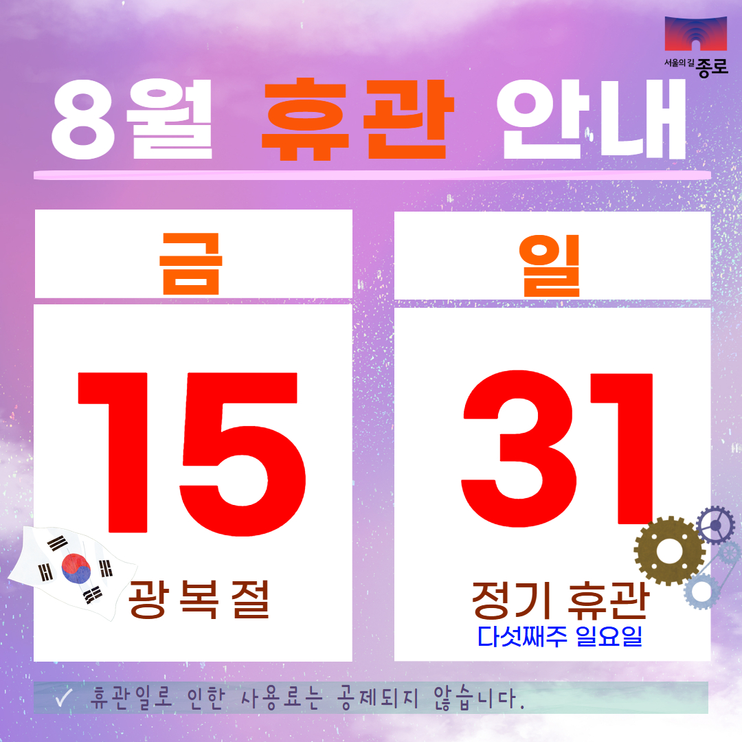 공지사항 게시판 상세 8월 휴관 안내 시설명 종로구시설관리공단 등록일 2025년 7월 17일 9시 30분 조회수 623 파일 8월휴관일.jpg [ Size : 730.59KB , Down : 83 ] 미리보기 다운로드 목록보기