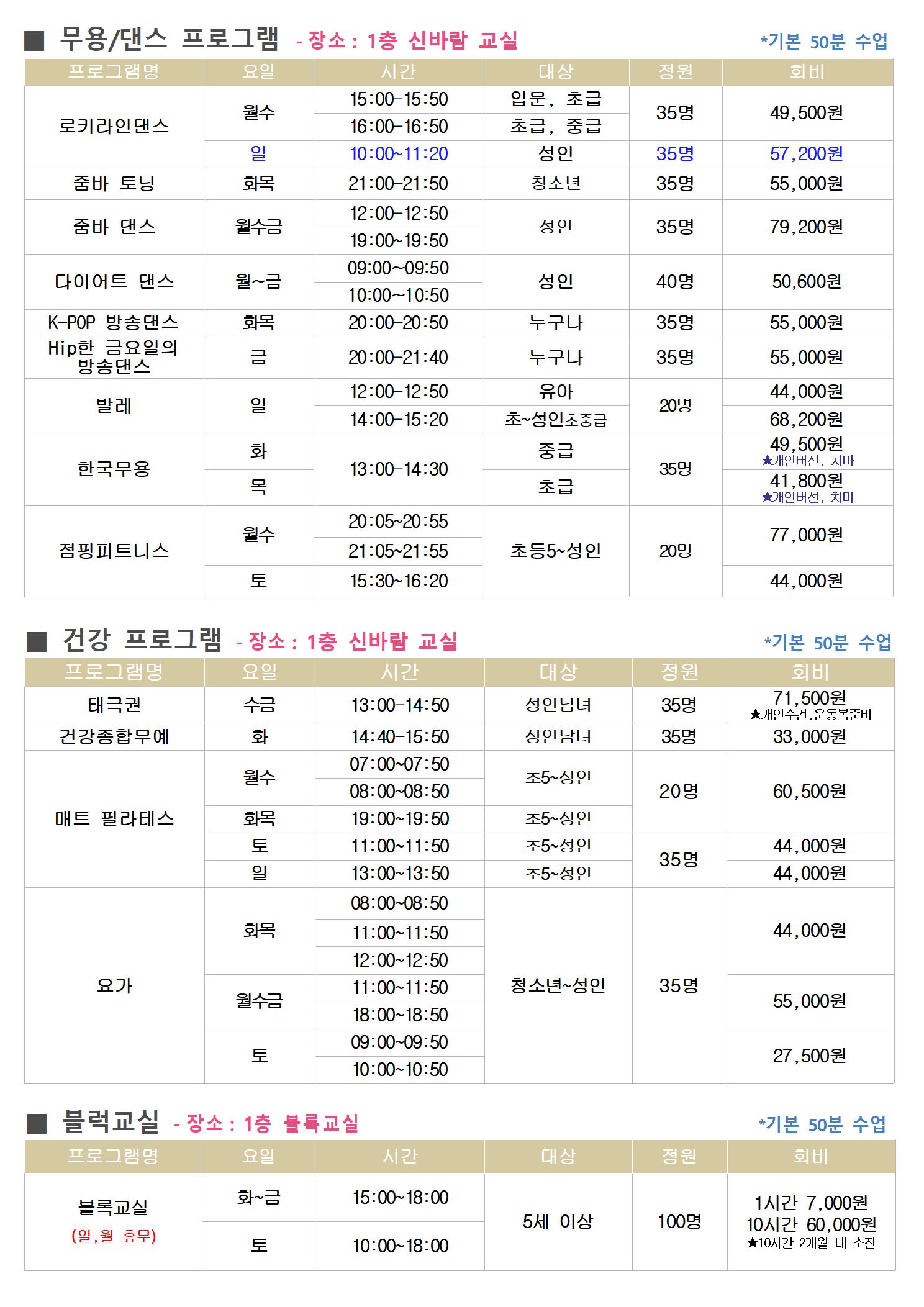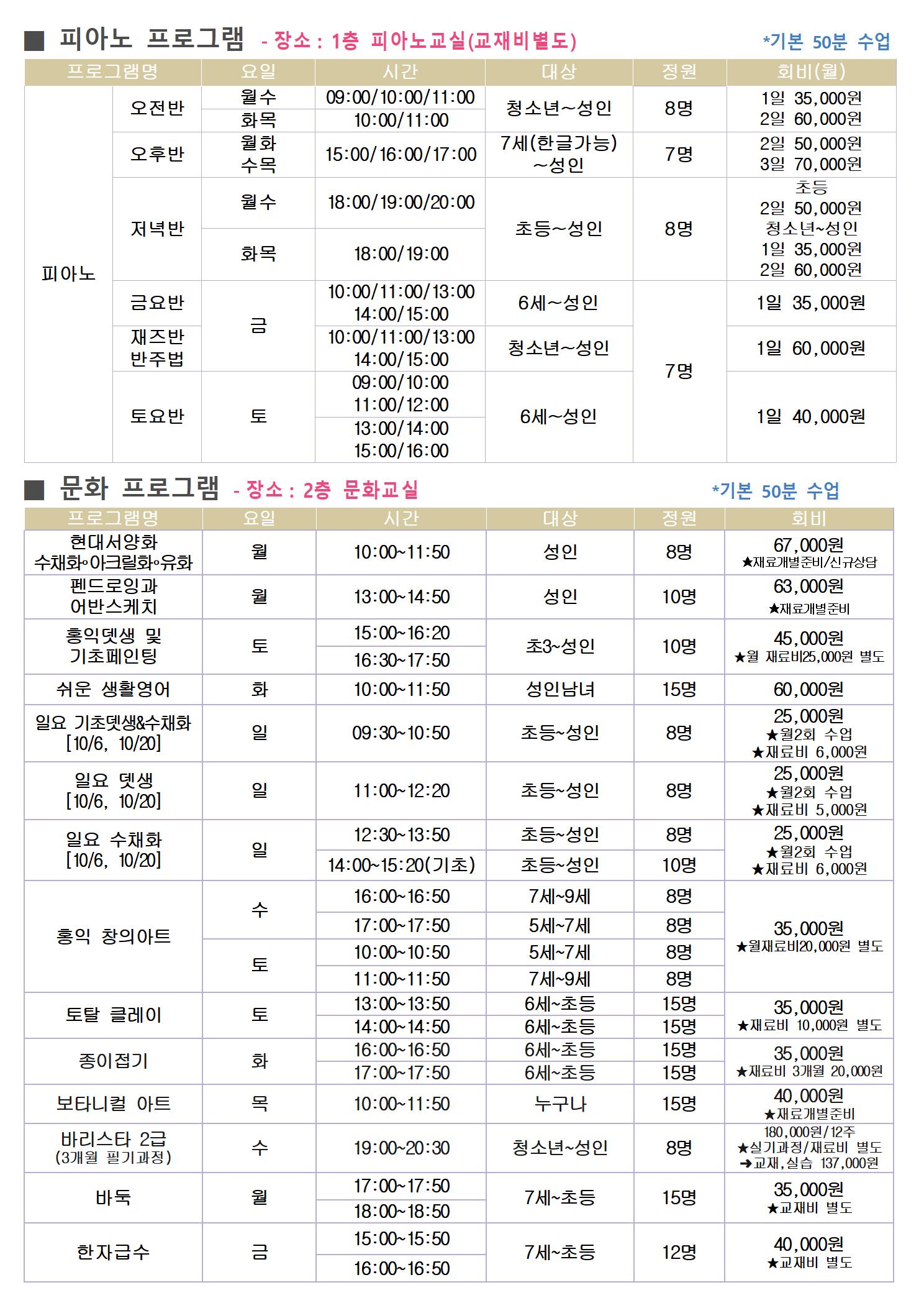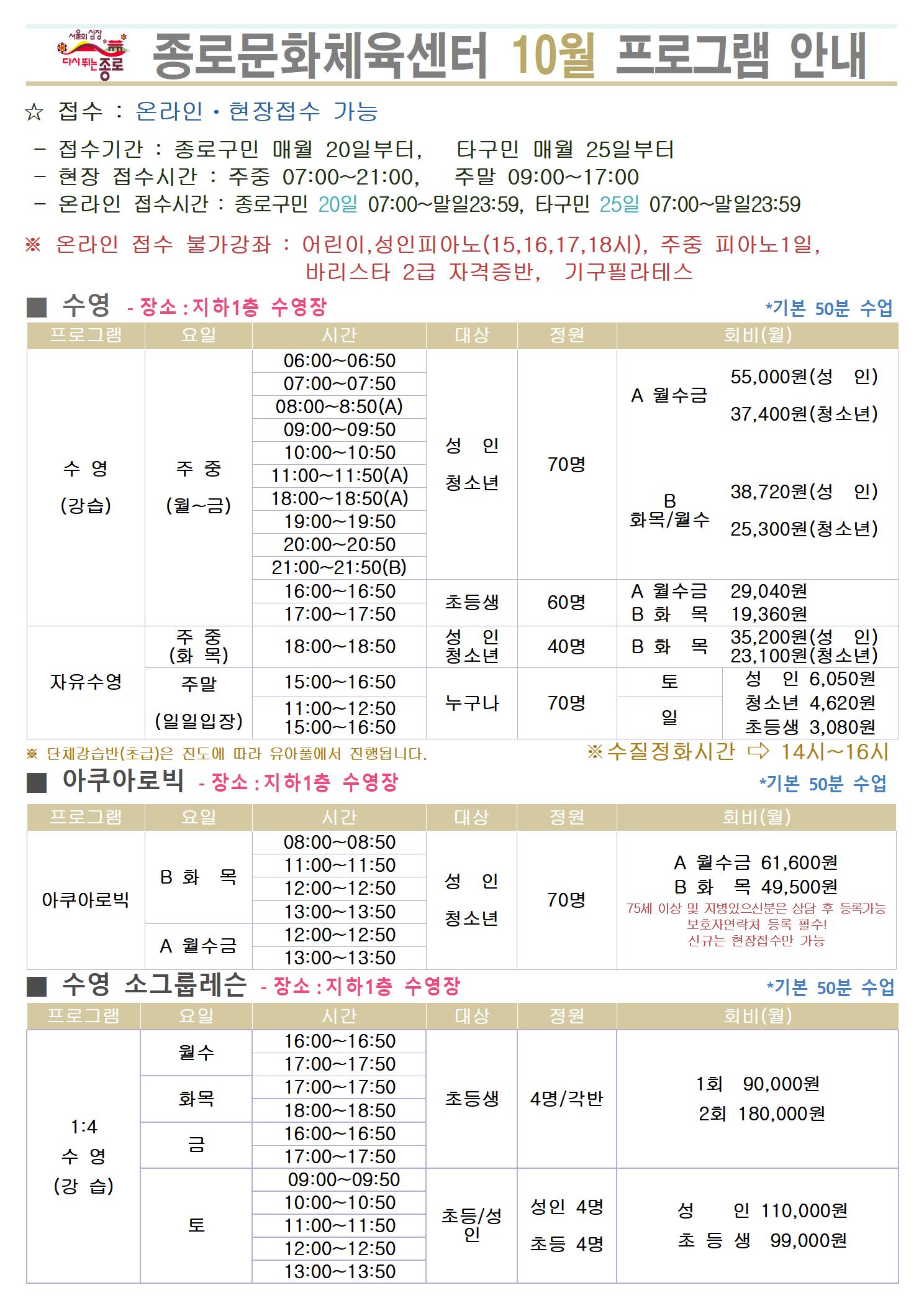공지사항 게시판 상세 10월 접수 및 프로그램 안내 시설명 종로문화체육센터 등록일 2024년 9월 13일 10시 8분 조회수 2,769 파일 10월 프로그램접수 안내 (2).jpg [ Size : 848.05KB , Down : 324 ] 미리보기 다운로드 문화체육센터 10월 운영프로그램001.jpg [ Size : 404.32KB , Down : 289 ] 미리보기 다운로드 문화체육센터 10월 운영프로그램002.jpg [ Size : 374.1KB , Down : 184 ] 미리보기 다운로드 문화체육센터 10월 운영프로그램003.jpg [ Size : 358.93KB , Down : 161 ] 미리보기 다운로드 문화체육센터 10월 운영프로그램004.jpg [ Size : 443.85KB , Down : 152 ] 미리보기 다운로드 문화체육센터 10월 운영프로그램005.jpg [ Size : 286.15KB , Down : 168 ] 미리보기 다운로드 목록보기