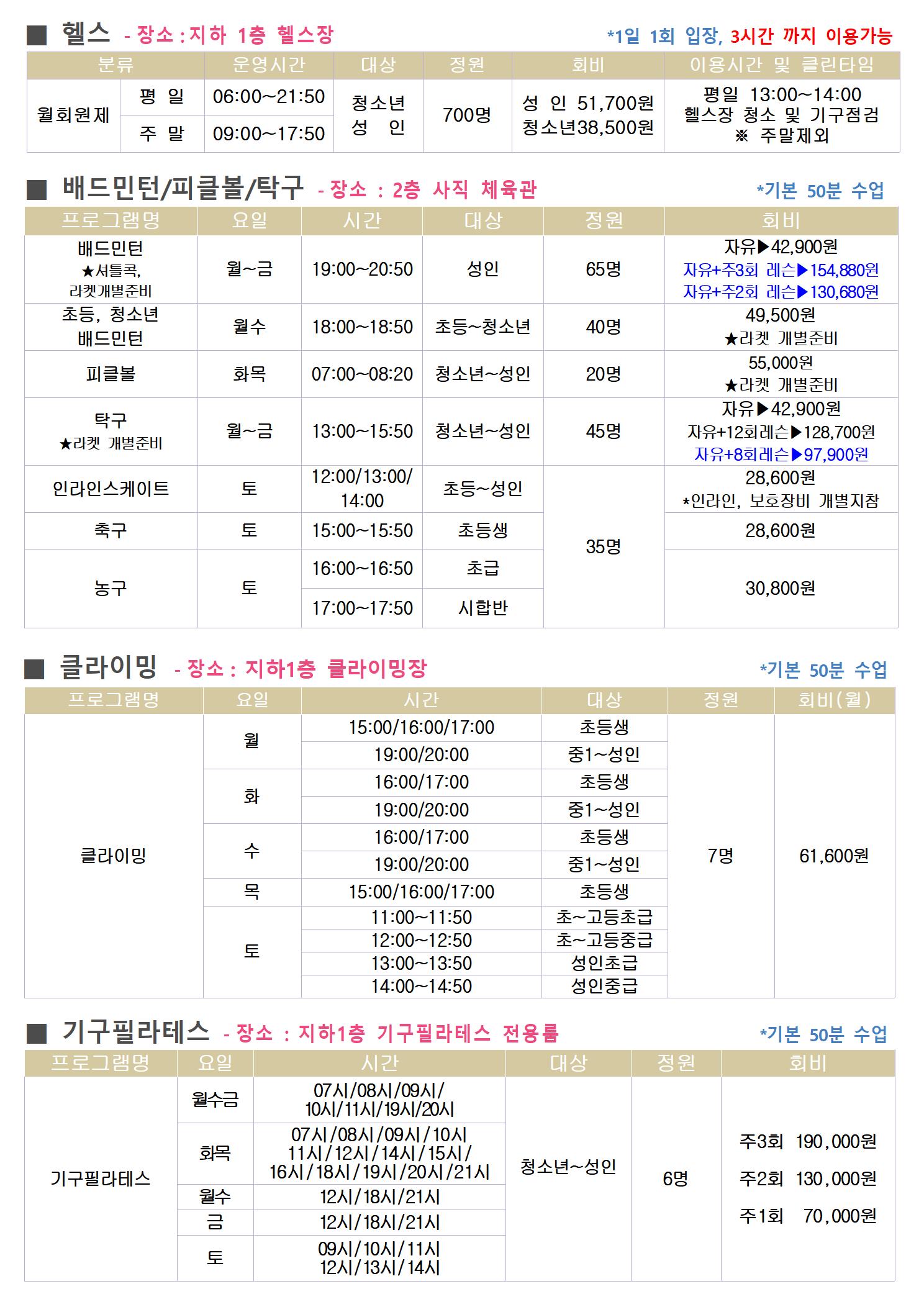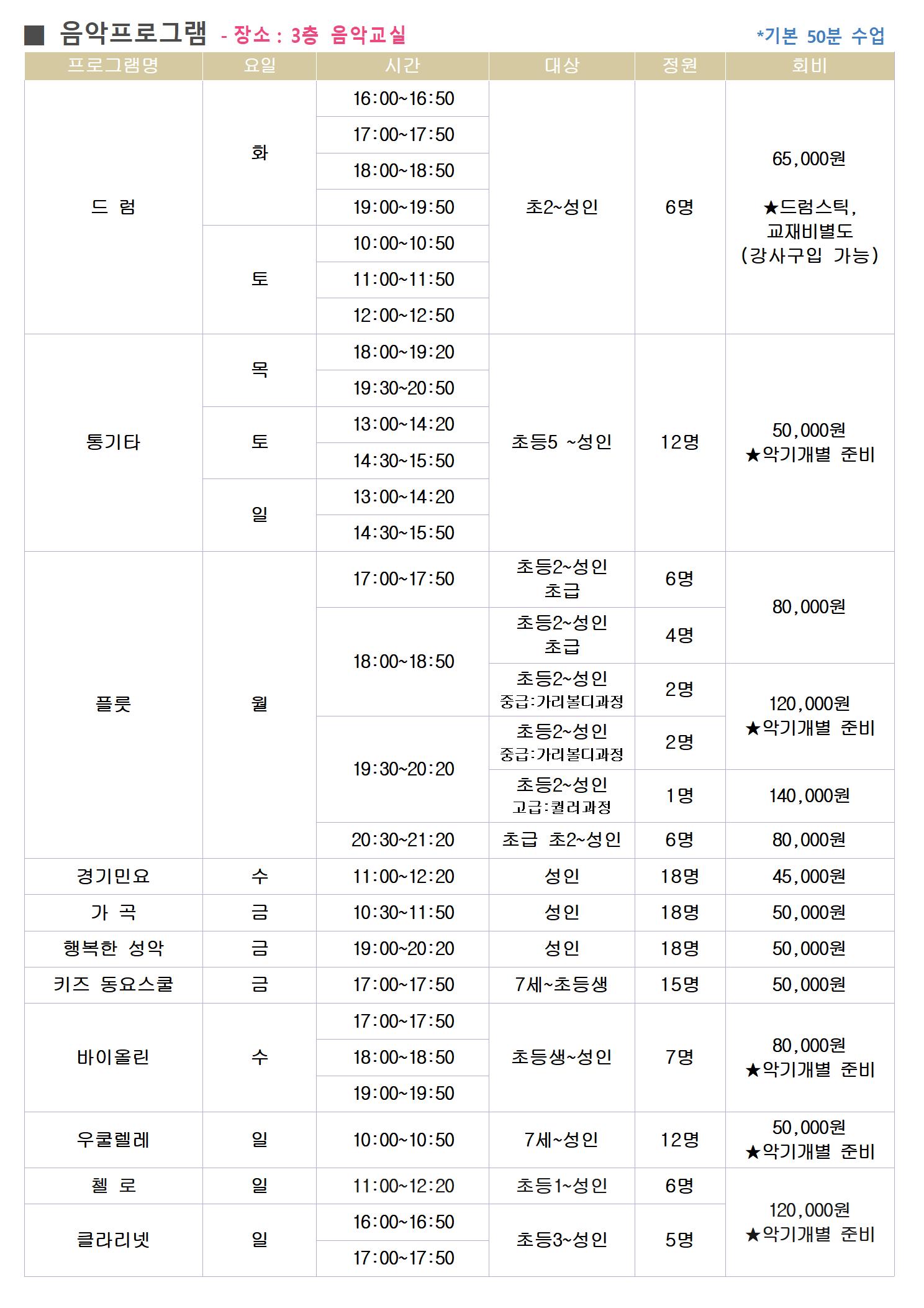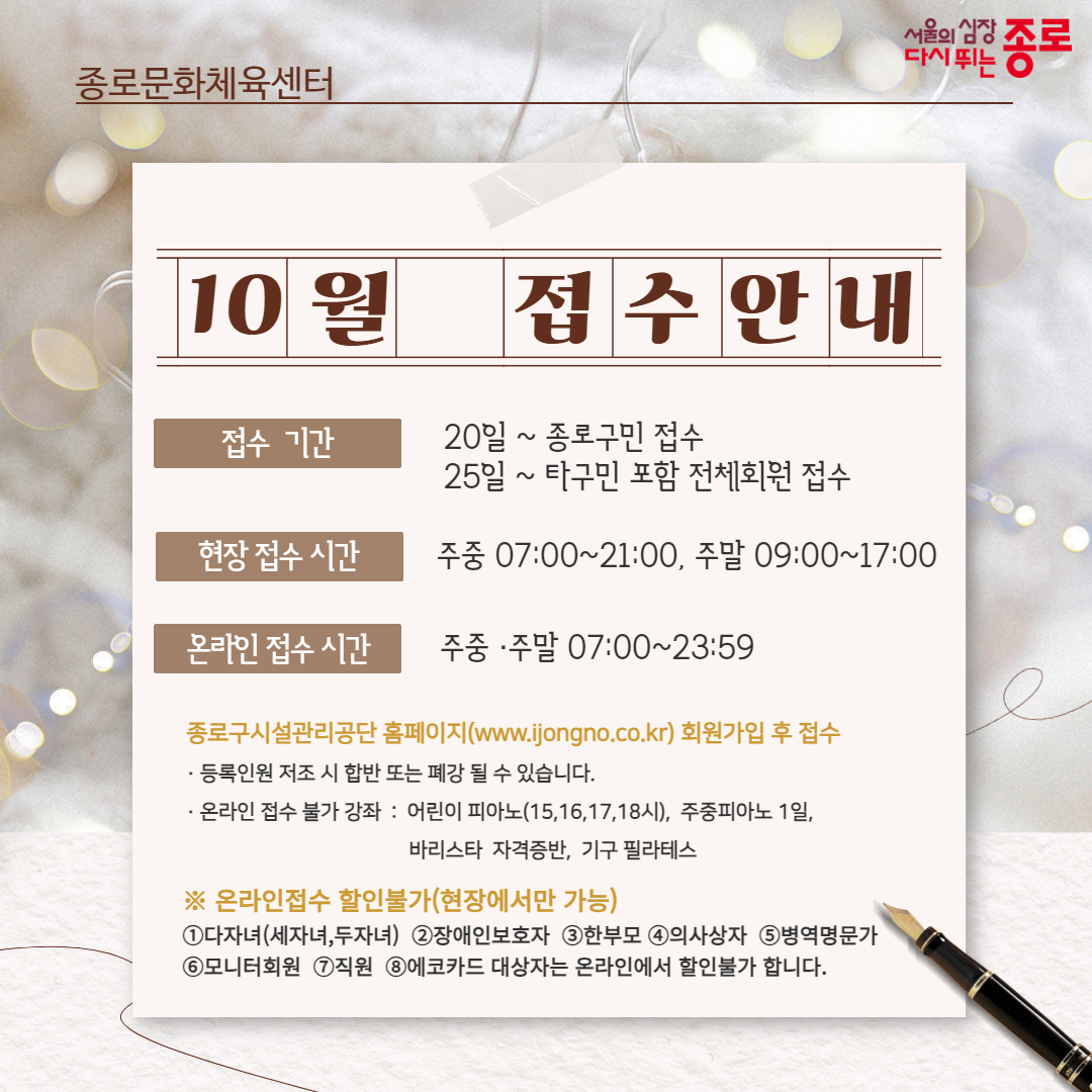 공지사항 게시판 상세 10월 접수 및 프로그램 안내 시설명 종로문화체육센터 등록일 2024년 9월 13일 10시 8분 조회수 2,769 파일 10월 프로그램접수 안내 (2).jpg [ Size : 848.05KB , Down : 324 ] 미리보기 다운로드 문화체육센터 10월 운영프로그램001.jpg [ Size : 404.32KB , Down : 289 ] 미리보기 다운로드 문화체육센터 10월 운영프로그램002.jpg [ Size : 374.1KB , Down : 184 ] 미리보기 다운로드 문화체육센터 10월 운영프로그램003.jpg [ Size : 358.93KB , Down : 161 ] 미리보기 다운로드 문화체육센터 10월 운영프로그램004.jpg [ Size : 443.85KB , Down : 152 ] 미리보기 다운로드 문화체육센터 10월 운영프로그램005.jpg [ Size : 286.15KB , Down : 168 ] 미리보기 다운로드 목록보기