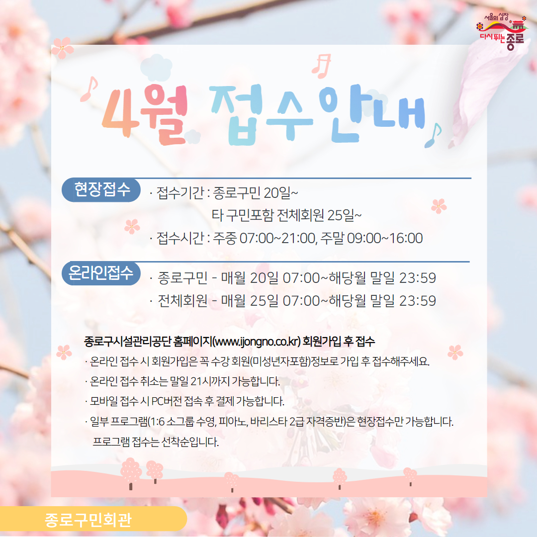 공지사항 게시판 상세 4월 접수 및 프로그램 안내 시설명 종로구민회관 등록일 2024년 4월 12일 16시 53분 조회수 638 파일 제목을 입력하세요 (8).jpg [ Size : 868.45KB , Down : 683 ] 미리보기 다운로드 제목을 입력하세요 (11).jpg [ Size : 5.82MB , Down : 610 ] 미리보기 다운로드 제목을 입력하세요 (12).jpg [ Size : 4.92MB , Down : 627 ] 미리보기 다운로드 목록보기