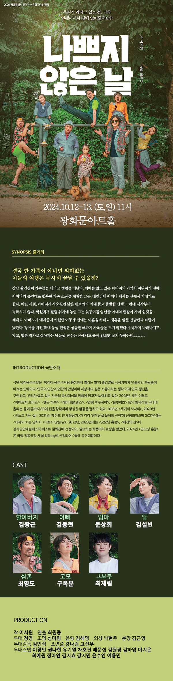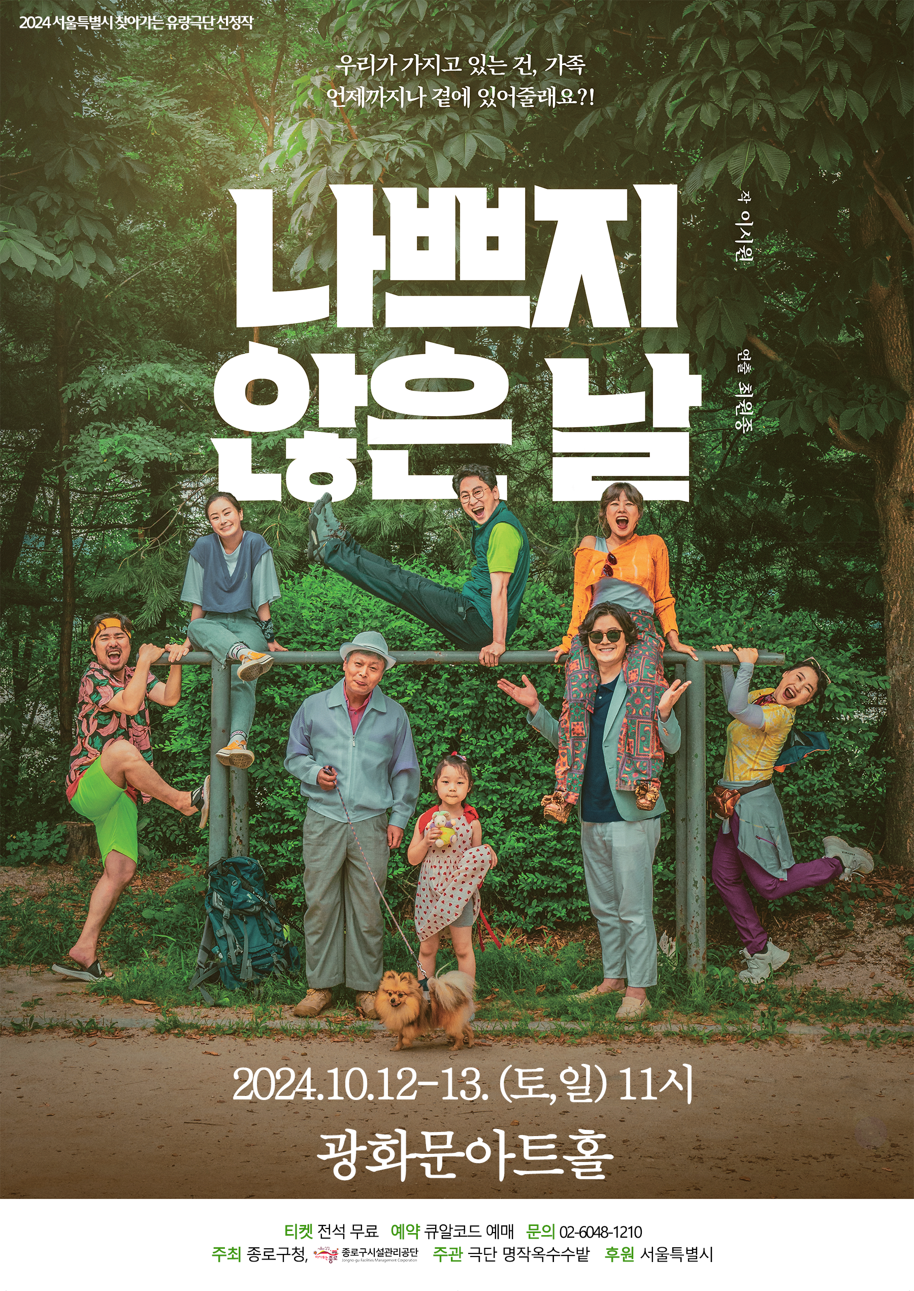 안녕하십니까 구민이 행복한 문화체육플랫폼 1등공단 종로구시설관리공단입니다. 종로구시설관리공단에서는 구민의 문화향유기회 확대를 위해 서울시 주관 '찾아가는 유랑극단'사업의 운영자로 2년 연속 선정되었습니다. 서울시 선정 우수 공연을 주민들에게 무료로 제공하니 관심있는 주민들께서는 많은 참여 바랍니다. 이번에 소개할 공연은 나쁘지 않은날(극단 명작 옥수수밭)입니다. 예매링크 : https://form.naver.com/response/u5c_d5hQIwYpVFKVrXH_4A 감사합니다.