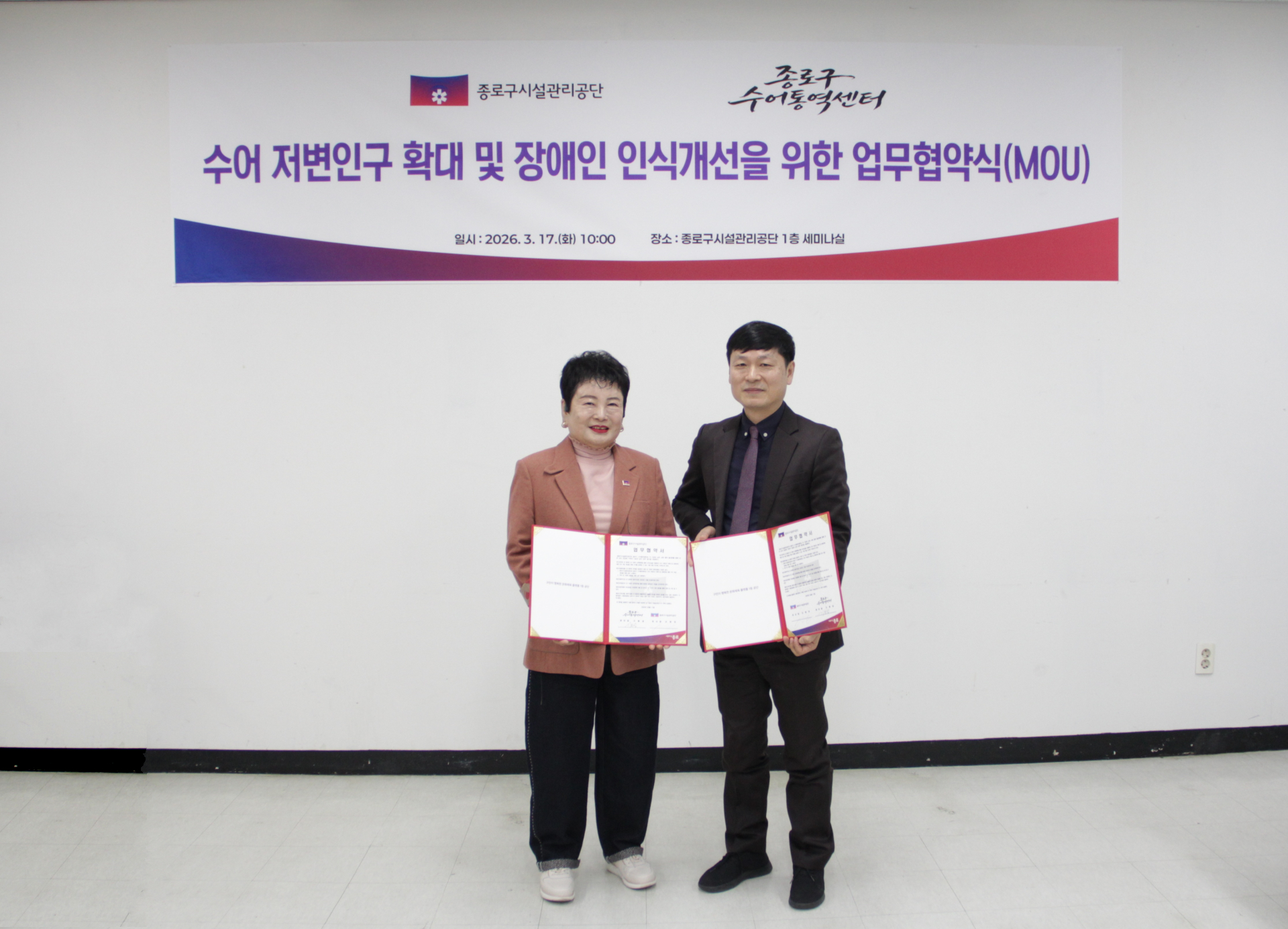 종로구시설관리공단, 종로구 수어통역센터 업무협약 체결 - 수어 저변 확대와 장애 인식 개선을 위한 협력 기반 마련 - ▲ 협약 후 사진촬영 중인 종로구시설관리공단 이사장(왼쪽)과 종로구 수어통역센터 센터장(오른쪽)