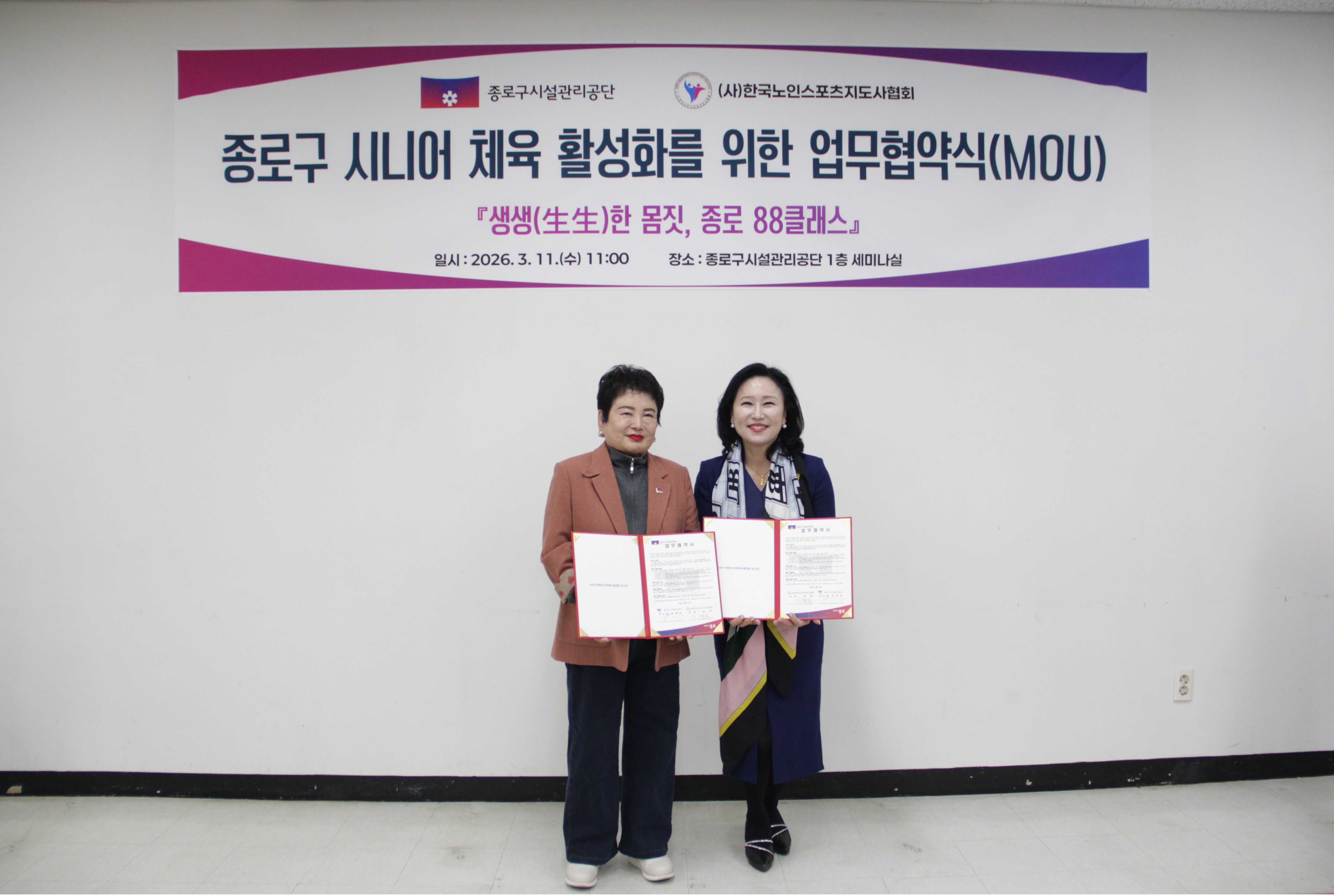 종로구시설관리공단(이사장 신영자)은 지난 11일 (사)한국노인스포츠지도사협회와 지역 어르신의 건강증진과 생활체육 활성화를 위한 업무협약(MOU)을 체결했다고 밝혔다. 이번 협약은 고령화 사회에 대응하여 어르신의 신체적·인지적 건강을 동시에 증진할 수 있는 맞춤형 프로그램을 공동으로 운영하고, 전문 인력을 활용한 체계적인 생활체육 서비스를 제공하기 위해 추진됐다. 양 기관은 협력을 통해 지역사회 어르신들이 보다 안전하고 전문적인 환경에서 건강 프로그램에 참여할 수 있도록 지원할 예정이다. 협약에 따라 시니어 대상 인지·신체 통합형 건강증진 프로그램을 공동으로 기획하고 운영할 예정이며, 특히 협회 소속 전문 강사를 프로그램에 지원함으로써 체계적이고 안전한 어르신의 신체활동 증진과 인지 기능 향상을 위한 다양한 생활체육 프로그램을 개발해 지속적으로 확대해 나갈 계획이다. 신영자 이사장은 “종로구는 서울 자치구 가운데 고령 인구 비율이 높은 지역에 속한다. 이러한 상황에 발맞춰 공단 또한 시니어 대상 프로그램 확대와 교류 활성화를 위해 적극적으로 노력하고 있다. 이번 협약을 통해 지역 어르신들이 보다 전문적이고 체계적인 생활체육 프로그램을 접할 수 있는 기반이 마련됐다”며 “앞으로도 양 기관이 긴밀한 협력과 교류를 이어가며 지역사회 어르신의 건강한 삶과 활기찬 지역사회 조성을 위해 지속적으로 노력하겠다”고 말했다. |