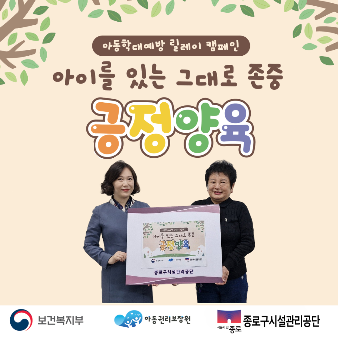 종로구시설관리공단 아동학대 예방 릴레이 캠페인 동참 - 긍정양육 문화 확산을 위해 지역기관과 함께 릴레이 캠페인 참여 - ▲ 종로구시설관리공단 신영자 이사장(우측)이 아동학대 예방 릴레이 캠페인에 참여하였다. 종로구시설관리공단(이사장 신영자)은 지난 23일 아동학대 예방 및 긍정양육 인식 확산을 위한 아동학대 예방 릴레이 캠페인에 참여하였다고 밝혔다. 이번 캠페인은 보건복지부와 아동권리보장원이 주관하며, 아동학대에 대한 경각심을 높이고 아동을 독립된 인격체로 존중하는 양육 문화를 알리기 위해 시작하였다. 종로구시설관리공단은 핫둘핫둘 유아스포츠단 프로그램과 서울형 키즈카페 혜명아이들 상상놀이터 등 다양한 아동 관련 시설이 있으며, 이를 통해 아이들이 건강하고 안전하게 성장할 수 있는 환경을 조성하기 위해 노력하고 있다. 이번 캠페인은 릴레이 형식으로 진행되며, 참여 기관이 다음 참여 기관을 지목하는 방식으로 이루어진다. 종로구시설관리공단은 강동구도시관리공단의 지목을 받아 캠페인에 동참하였으며, 다음 참여 기관으로 종로구육아종합지원센터와 종로구정신건강복지센터를 지목했다. 공단 신영자 이사장은 “아동은 우리 사회의 중요한 구성원이자 미래를 이끌어 갈 주체입니다. 아동학대 예방은 우리 모두가 함께 책임져야 할 문제이며, 공단은 앞으로도 아동 권리 보호와 긍정적인 양육 환경 조성을 위해 최선을 다하겠습니다”라고 말했다. |