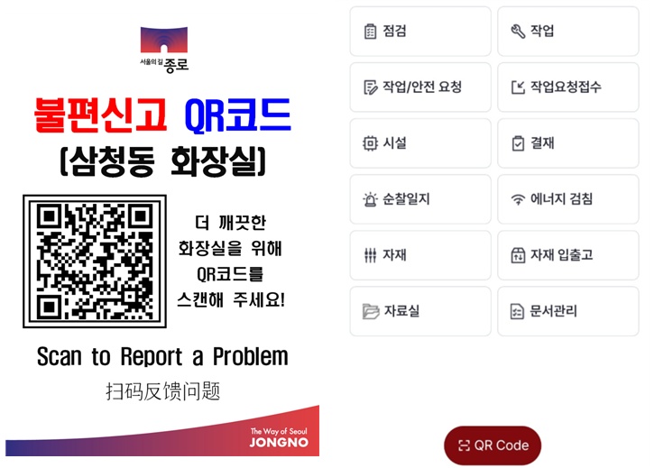 종로구공단, 공중화장실 관리 신규 사업 개시 ‘24시간 QR코드 민원 시스템’ 첫 도입 - 종로구 관내 공중화장실 위탁 운영으로 전문적·체계적 관리 체계 구축 - ▲ 공중화장실 24시간 민원접수 QR코드(왼쪽) 및 관리용 시설물유지관리시스템 화면(오른쪽)