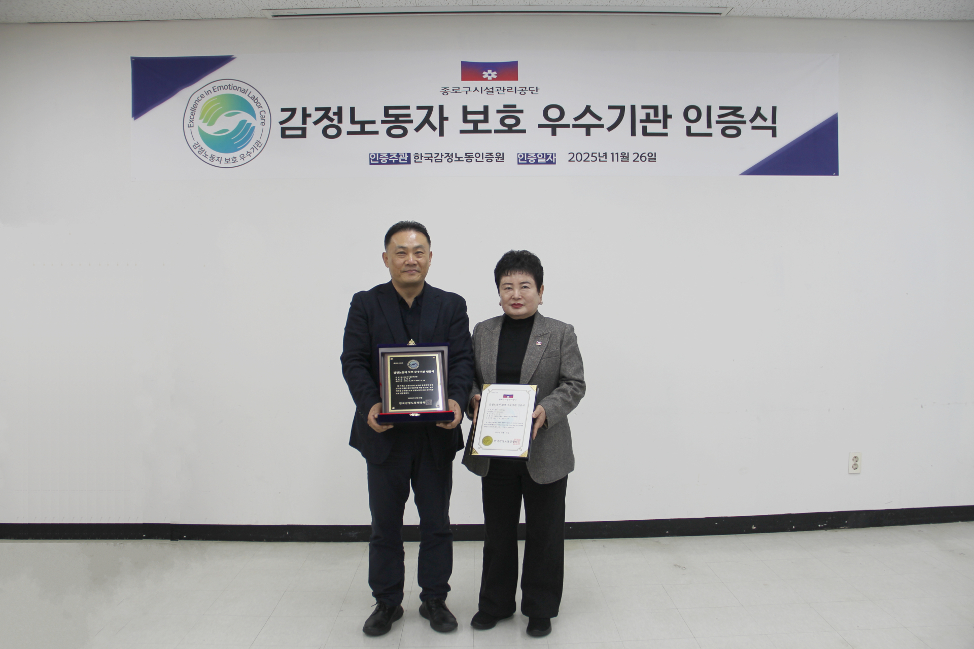종로구시설관리공단, 감정노동자 보호 우수기관 인증 획득 - 건강한 직장문화 조성 성과 인정받아 공공기관 책임성 강화 - ▲ 감정노동자 보호 우수기관 인증패와 인증서를 들고 사진 촬영 중인 종로구시설관리공단 이사장(오른쪽)과 한국감정노동인증원 대표(왼쪽) 종로구시설관리공단(이사장 신영자)은 지난 26일, 한국감정노동인증원(KCCEL)으로부터 ‘감정노동자 보호 우수기관 인증’을 획득했다고 밝혔다. 감정노동자 보호 우수기관 인증은 감정노동자의 권익 보호와 근무 여건을 체계적으로 개선한 기관에 부여되는 제도로, 공단의 지속적인 조직문화 개선 노력이 외부 기관으로부터 공인된 성과라는 점에서 큰 의미를 갖는다. 공단은 고객 접점부서에서 근무하는 직원들이 안전하고 존중받는 환경에서 일할 수 있도록 다양한 내부 지원 체계를 마련해 왔다. 특히 감정노동 권리보장 교육을 통해 민원 발생 시 적절한 대처 방법과 직원의 권리를 안내하고, 감정오일 힐링테라피와 마음건강 챙김 교육 등 스트레스 관리 프로그램을 병행하여 직원들의 심리적 안정과 안전한 업무 수행을 위해 지속적으로 지원해 왔다. 이번 인증 과정은 서면 심사와 현장 평가를 중심으로 진행됐으며, 서면 심사에서는 직원 대상 감정노동 진단 테스트 결과와 감정 노동 보호 활동 관련 실적이 종합적으로 평가됐다. 이어진 현장 평가에서는 책임자 및 담당자 인터뷰 등을 통해 실제 정책이 조직 내에서 안정적으로 작동하고 있는지 여부가 심층적으로 검증됐다. 공단은 이번 인증을 계기로 직원 보호정책을 더욱 내실화하고, 서비스 제공 과정에서 발생할 수 있는 감정·심리적 부담을 최소화하는 환경을 조성해 나갈 계획이다. 이러한 노력은 조직의 지속가능성을 강화하고, 대민 서비스를 제공하는 공공기관으로서의 책임 이행에도 기여할 것으로 기대된다. 신영자 이사장은 “이번 인증은 공단 구성원 모두가 건강하고 안전하게 일할 수 있는 근무 환경을 만들기 위한 노력의 결과”라며 “앞으로도 직원이 존중받는 직장문화를 정착시키고, 이를 기반으로 주민들에게 안정적이고 신뢰받는 공공서비스를 제공하겠다.”고 밝혔다. 종로구시설관리공단은 이번 인증 취득을 통해 구축된 보호체계를 지속적으로 발전시키고, 현장 중심의 조직 운영을 강화하여 주민에게 더 나은 공공서비스를 제공하는 기관으로 나아갈 방침이다. |