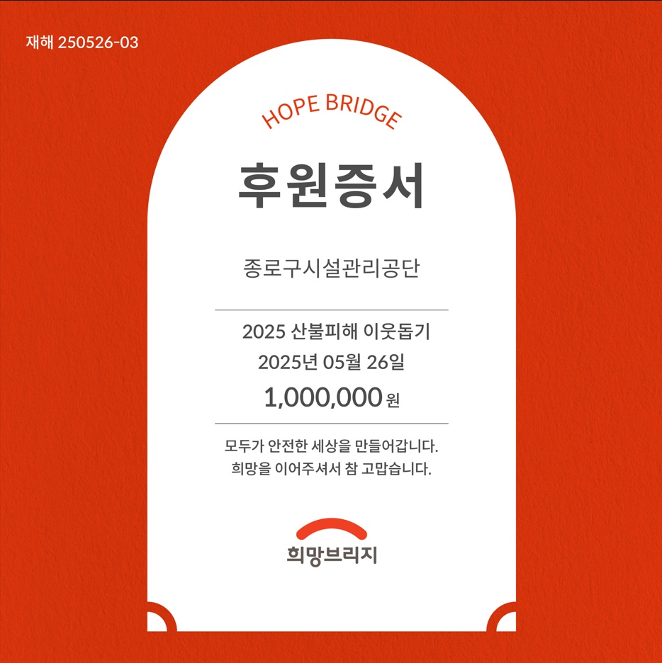 종로구시설관리공단, 산불 피해 이웃돕기 성금 전달 – ‘전국재해구호협회 희망브리지’ 통해 피해 지역 회복 지원 – ▲ 전국재해구호협회 ‘희망브리지’를 통해 받은 종로구시설관리공단 후원증서 원본 서울시 종로구시설관리공단(이사장 신영자)은 지난 26일(월)에 최근 발생한 산불로 피해를 입은 지역 주민들을 돕기 위해 전국재해구호협회 '희망브리지'에 성금 100만원을 전달했다. 이번 성금은 갑작스러운 재난으로 삶의 터전을 잃은 이재민들의 조속한 일상 복귀를 지원하고, 지역 사회의 회복을 돕기 위한 공단 임직원들의 뜻을 모아 마련됐다. 전달된 후원금은 ‘전국재해구호협회 희망브리지’를 통해 산불 피해 지역의 긴급 구호, 생필품 지원, 주거 복구 등 실질적인 피해 회복을 위한 지원에 사용될 예정이다. 신영자 이사장은 “예기치 못한 자연재해로 일상이 무너진 분들에게 깊은 위로를 전하며, 자연재해로 고통 받는 분들에게 조금이나마 위로와 도움이 되기를 바라는 마음으로 성금을 전달했다”며, “앞으로도 공공기관으로서 사회적 책임을 다하고, 나눔 활동에 지속적으로 동참하겠다.”고 밝혔다. |