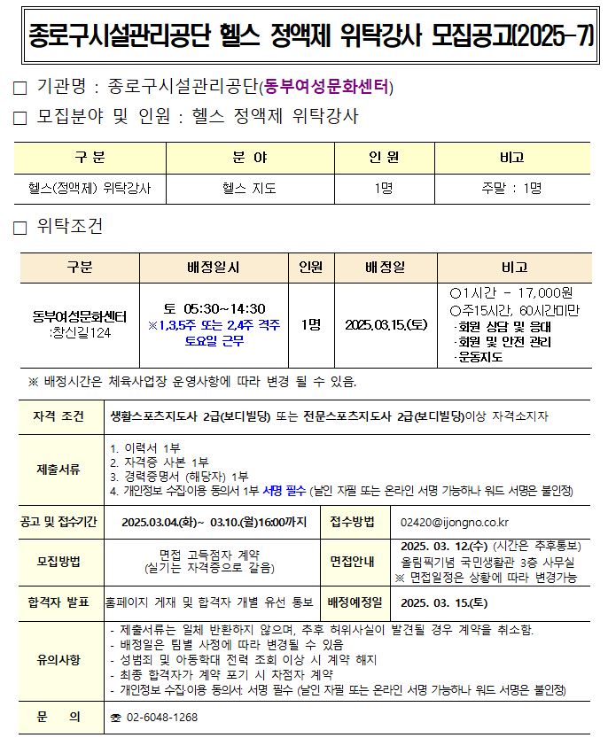 종로구시설관리공단(동부여성문화센터) 헬스 정액제 위탁강사 모집공고