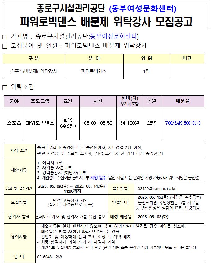 동부여성문화센터 파워로빅댄스 배분제 위탁강사 모집공고